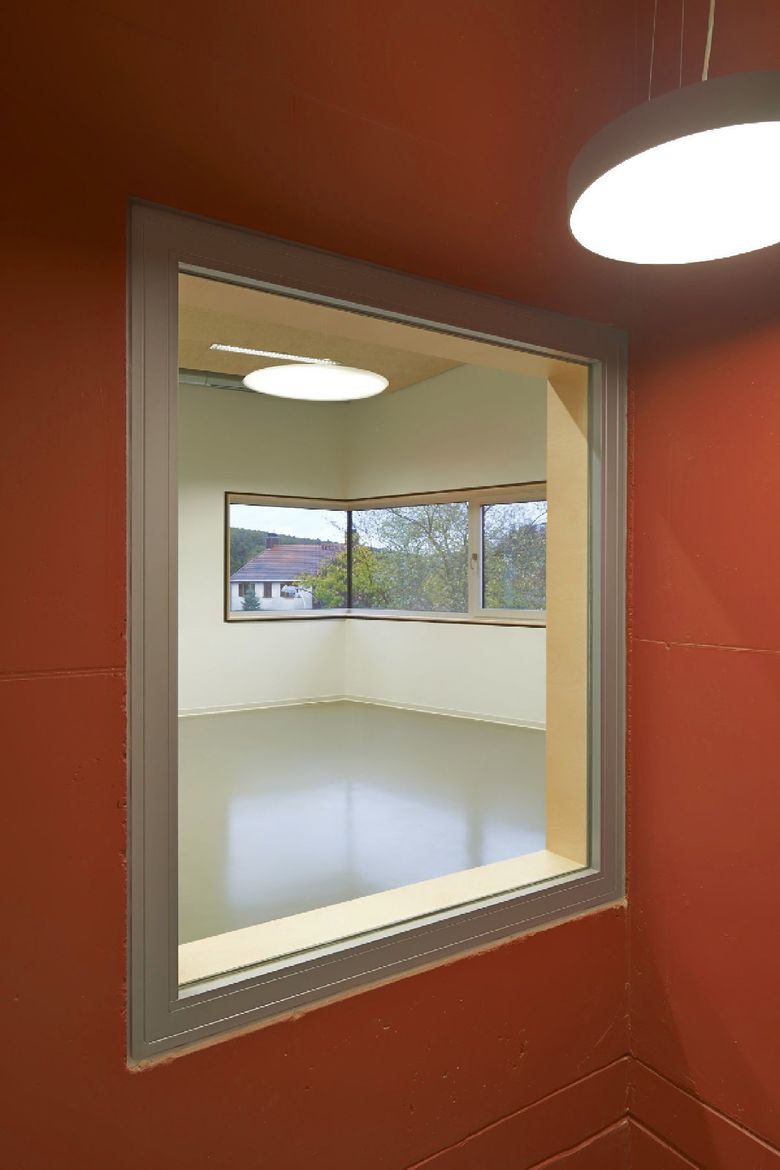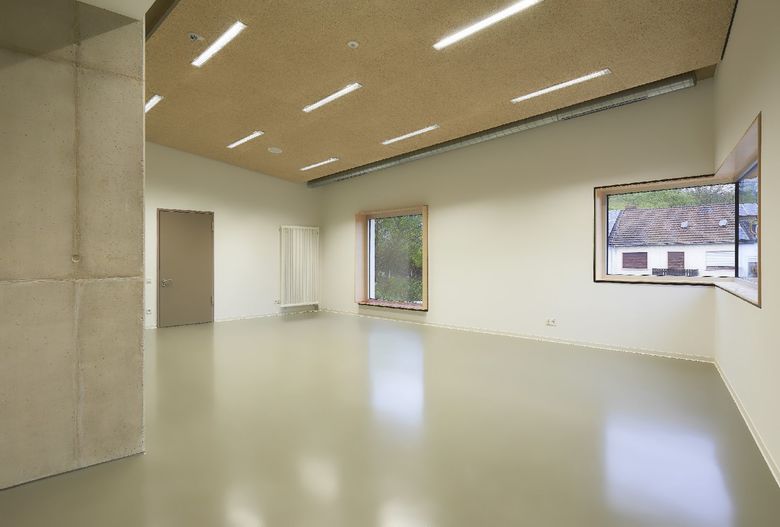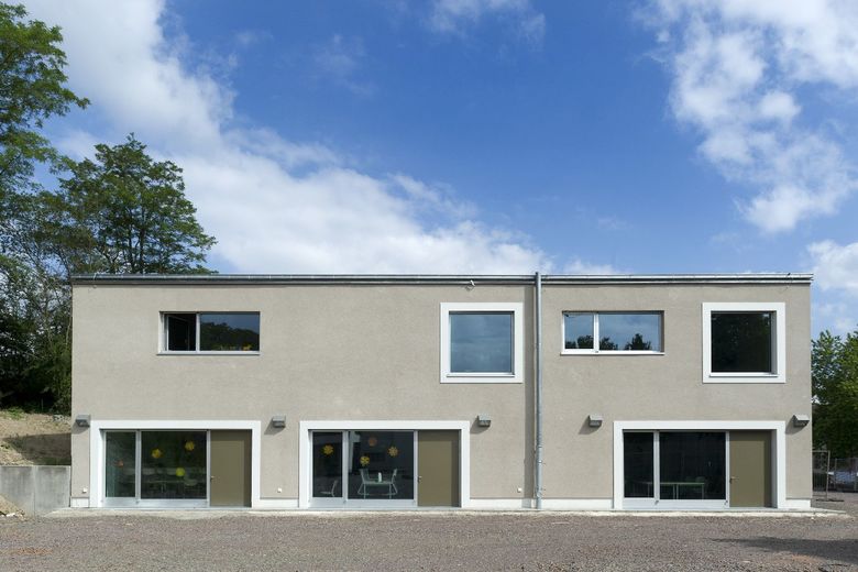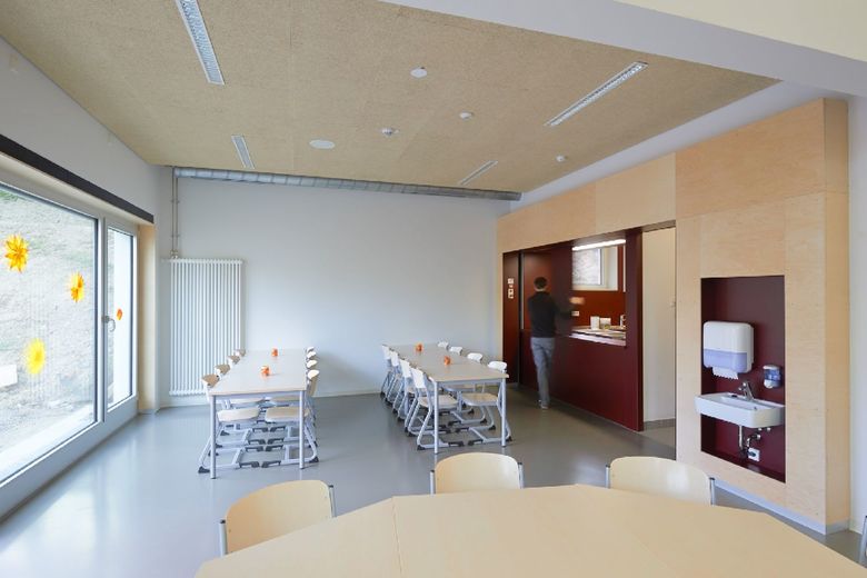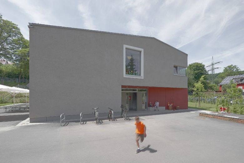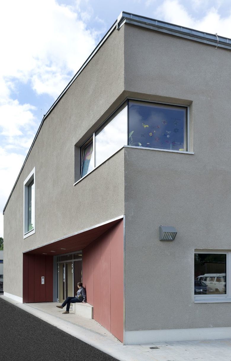 Die Maria-Montessori-Grundschule liegt im Ortskern des Saarbrücker Stadtteils Rußhütte und ist in einem im 19.Jahrhundert erbauten Schulhaus untergebracht. Im Zuge des Ausbaus zur Ganztagsschule ist bis zum Schuljahr 2013/14 eine Erweiterung für die Nachbetreuung entstanden. Der zweigeschossige Neubau nimmt sechs Gruppen-räume, Speise- und Multifunktionsraum mit Küche sowie diverse Nebenräume auf. Um auf die, durch einen Bahndamm topografisch beengte Grundstückssituation zu reagieren, wurde eine Gebäudeseite um 15° gedreht. Auf diese Weise entstand ein keilförmiger Grundriss, dessen Fokus auf den Altbau gerichtet ist. Es wurde eine Form gefunden, die dem Schulgebäude Selbstverständlichkeit und dem Ort Identität verleiht. Der Maßstab, die Ausformulierung der Fassade, das Satteldach, der erdige Kratzputz, szenische Ein- und Ausblicke sowie traditionelle Motive wie wettergeschützter Eingang mit Sitzbank und Fenster untermauern diese Haltung.