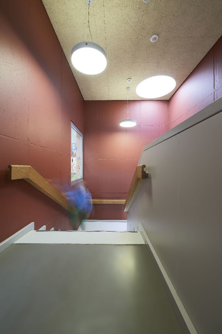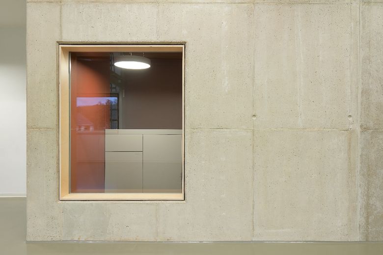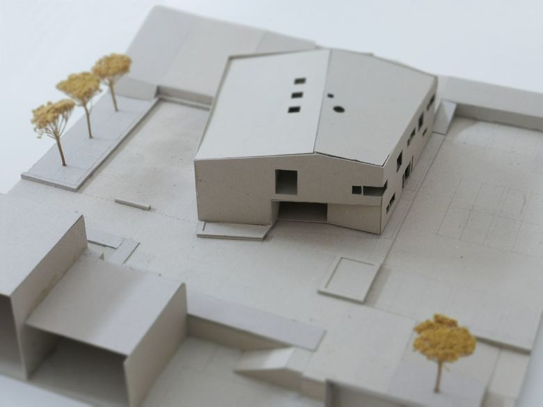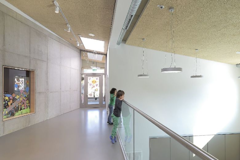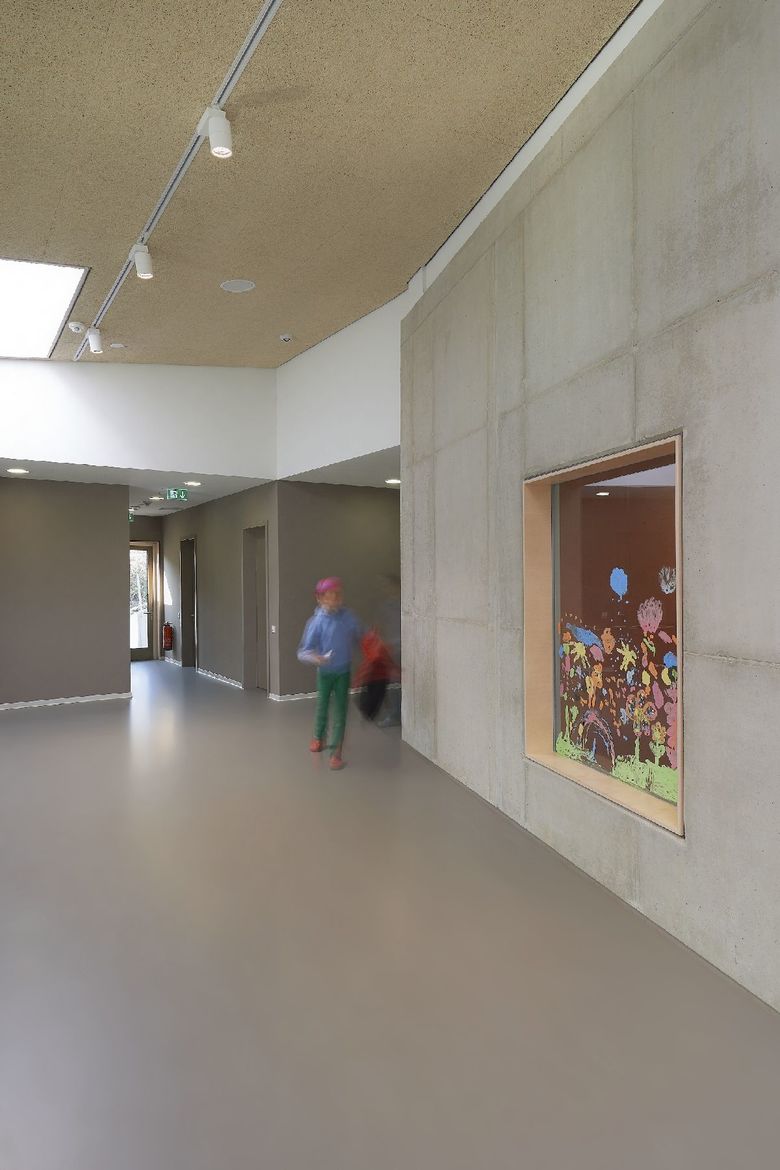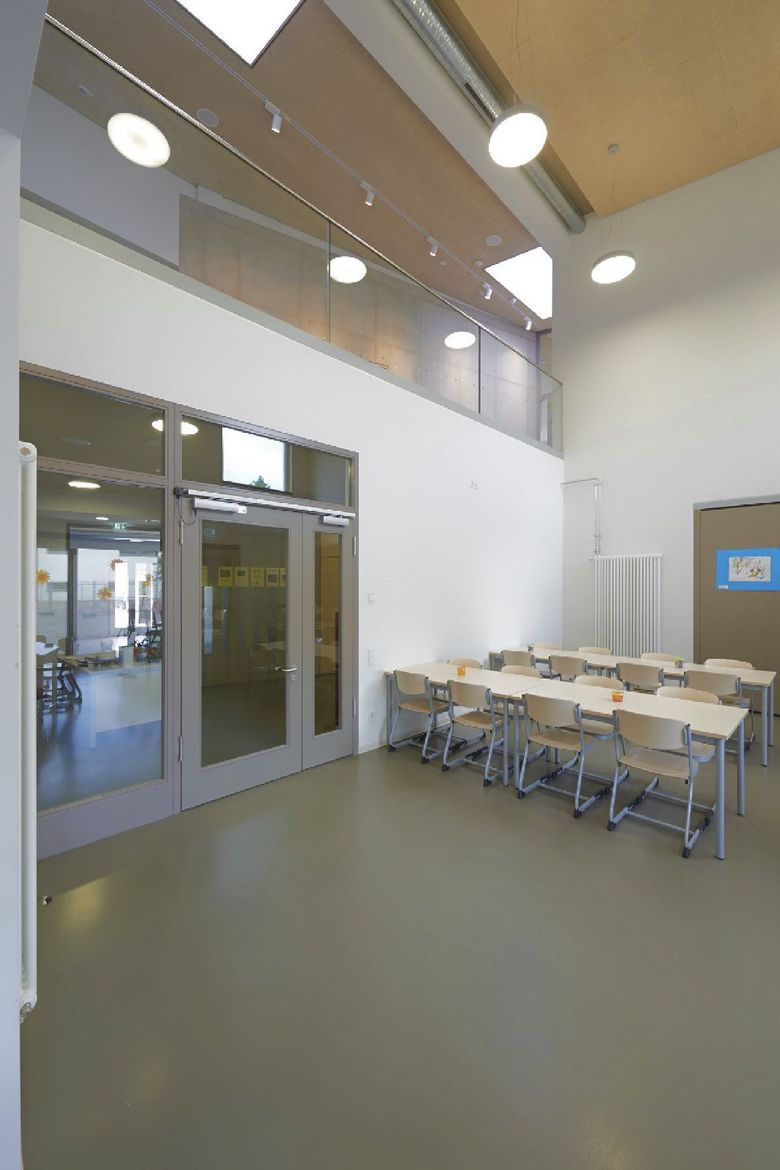 Die Maria-Montessori-Grundschule liegt im Ortskern des Saarbrücker Stadtteils Rußhütte und ist in einem im 19.Jahrhundert erbauten Schulhaus untergebracht. Im Zuge des Ausbaus zur Ganztagsschule ist bis zum Schuljahr 2013/14 eine Erweiterung für die Nachbetreuung entstanden. Der zweigeschossige Neubau nimmt sechs Gruppen-räume, Speise- und Multifunktionsraum mit Küche sowie diverse Nebenräume auf. Um auf die, durch einen Bahndamm topografisch beengte Grundstückssituation zu reagieren, wurde eine Gebäudeseite um 15° gedreht. Auf diese Weise entstand ein keilförmiger Grundriss, dessen Fokus auf den Altbau gerichtet ist. Es wurde eine Form gefunden, die dem Schulgebäude Selbstverständlichkeit und dem Ort Identität verleiht. Der Maßstab, die Ausformulierung der Fassade, das Satteldach, der erdige Kratzputz, szenische Ein- und Ausblicke sowie traditionelle Motive wie wettergeschützter Eingang mit Sitzbank und Fenster untermauern diese Haltung.