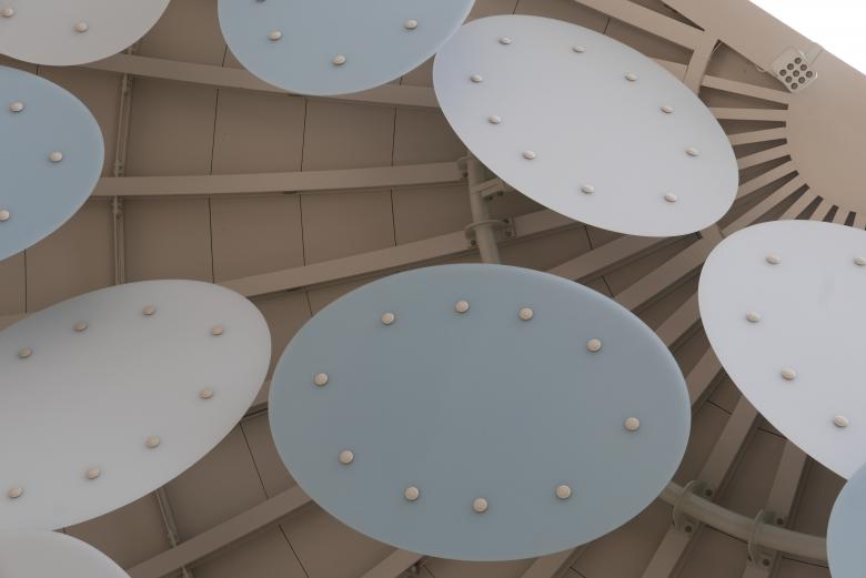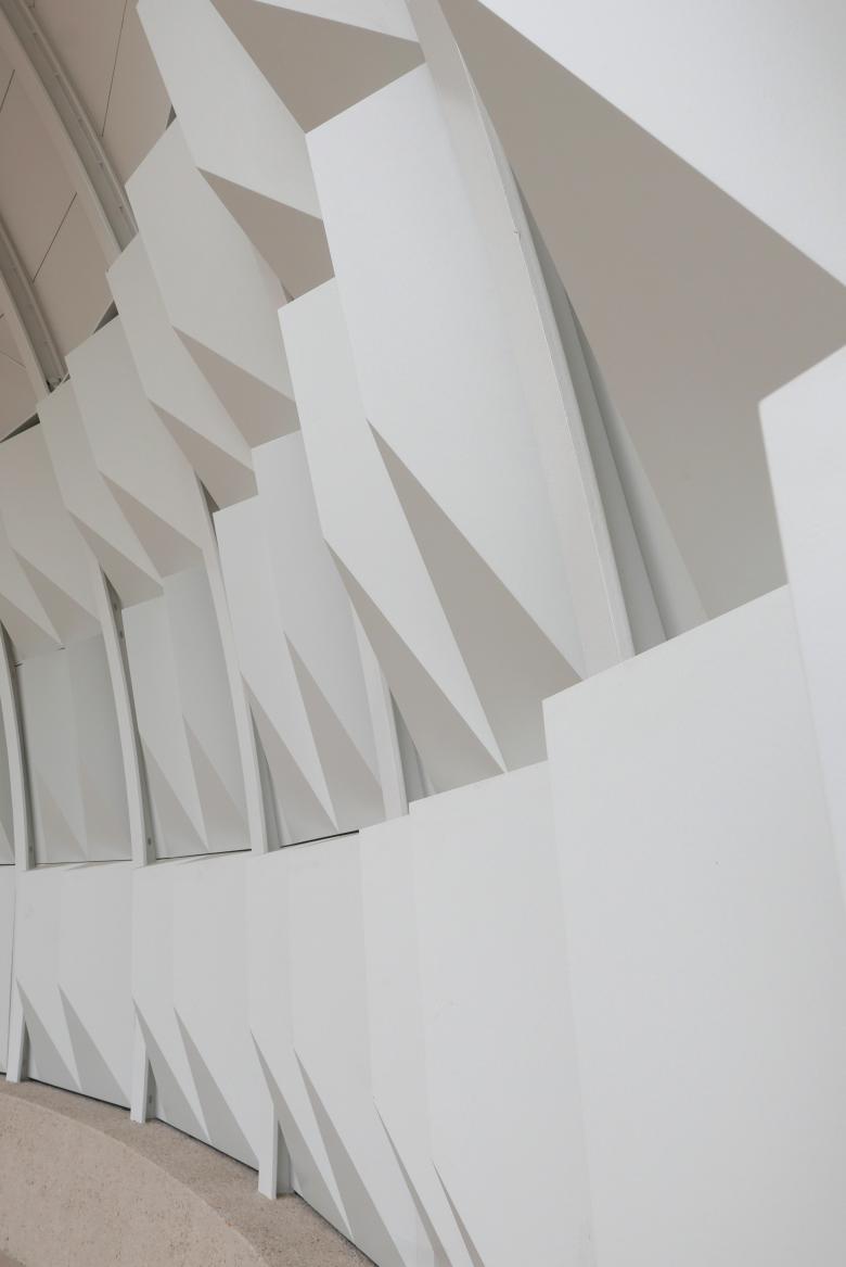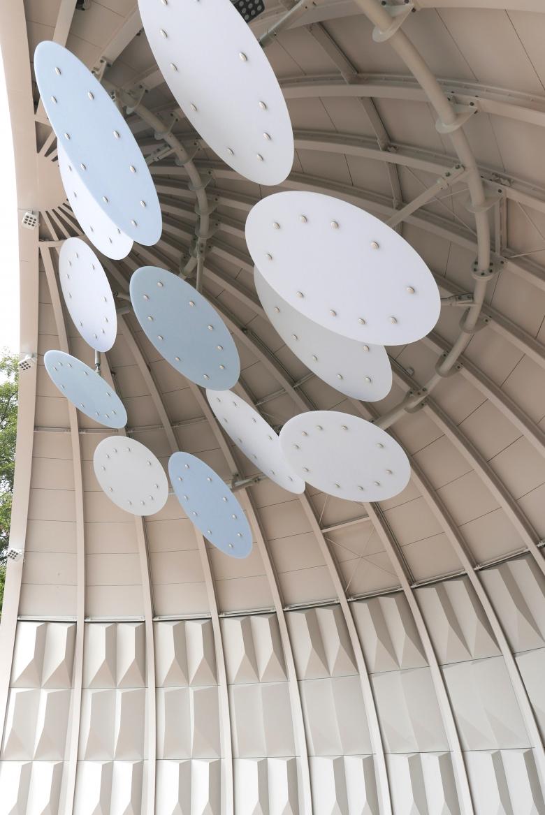 Der Sockelbereich erhält zwischen den vertikalen Stahlträgen bis in 4m Höhe innenseitig eine Verkleidung aus Holz-Elementen, sogenannte Kassetten, die aus Sperrholzplatten zusammengesetzt werden. Die Kassetten besitzen eine asymetrisch verzogene pyramidale bzw. diamantartige Form, um die akustischen Wellen in unterschiedlichen Richtungen zu brechen. Geometrisch bedingt ist eine Fortsetzung der Kassetten bis in den Scheitelbereich der Viertelkugel nicht möglich. Daher sind in diesem verengenden Bereich frei angeordnete Elemente in Form von 12 Ellipsenplatten vorgesehen. Diese Ellipsen bestehen aus einem leichten Kunststoff-Material mit 10 mm Plattenstärke, das gute Schall-Reflexionseigenschaften besitzt. Die Befestigung aus Aluminiumstangen und -haltern erlaubt eine flexible Ausrichtung der Ellipsenplatten, um eine optimale Einstellung zu den erzielenden Reflexionseigenschaften zu ermöglichen. Je nach akustischem Befund kann die Position der Ellipsen nachträglich geändert werden. Gestalterisch soll der durchscheinende bzw. transluzente Effekt der Kunststoffplatten an ein Wolkenmotiv erinnern.