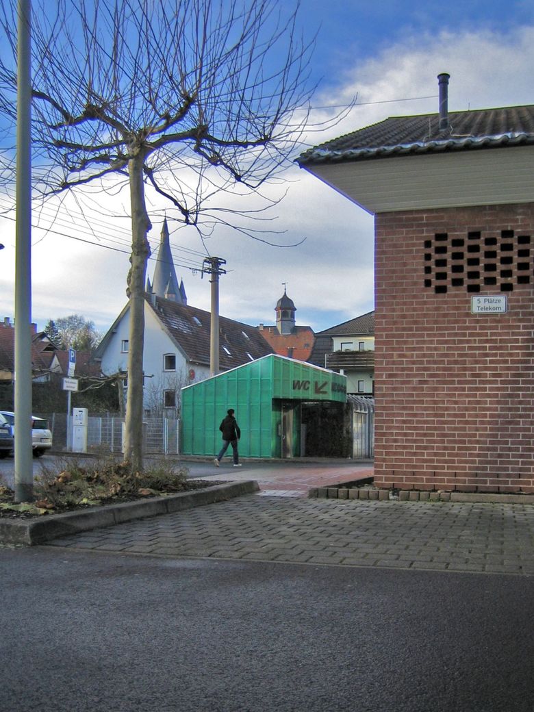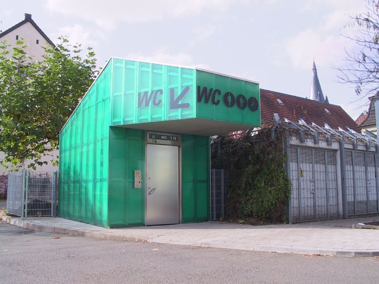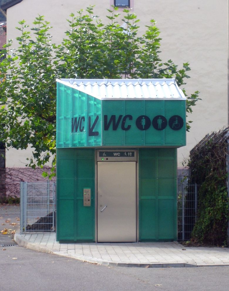 Wegen der touristischen Bedeutung Ottweilers wurde eine neue Toilettenanlage mit behindertengerechter Ausstattung notwendig. Zur Aufgabe gehörte eine Gebäudeplanung mit Integration einer automatisierten Sanitärtechnik sowie eine Neugestaltung des Umfeldes mit Pflasterbelag, Informationstafel und Sitzbank. Der Entwurf orientiert sich an der Grundform des giebelständigen Satteldachhauses, das für Ottweiler typisch ist.Diese wird dann auf die für das Raumprogramm notwendige Masse zurückgeschnitten. Ein Teil des Dachüberstandes verbleibt als Witterungsschutz. Grossformatige Piktogramme bieten eine gute Sichtbarkeit, auch vom Zugang Schlossplatz aus. Um der räumlichen Enge gegenüber dem Lagerhaus der Post zu begegnen, wird die Seitenfläche des Vordaches um ca. 20° geknickt. Dadurch wird die Gefahr einer Beschädigung durch vorbeifahrende LKW vermindert. Die äussere "Gebäudehaut" besteht aus farbigen transluzenten Platten, die hinterleuchtet werden. Damit wird das Gebäude bei Dunkelheit zu einem leuchtenden, kristallinen Körper.