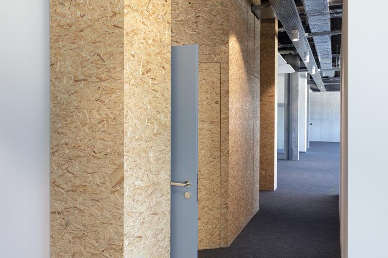 Unser Konzept ordnete die abgeschlossenen Funktionen – Nasszellen, Sitzungszimmer, Teeküchen – so zwischen die Stützen, dass diese optisch in Schränken und Wandflächen aufgingen. Sichtbeton, Gips und Holzwerkstoff verschmelzen zu einer ruhigen, zusammenhängenden Struktur.