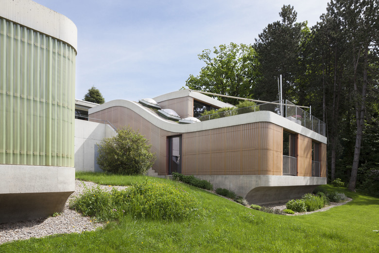 Die Wirkung der geschwungenen Decken und abgerundeten Ecken im Innenraum wird verstärkt durch die reduzierte ehrliche Materialwahl; Sichtbetondecken, eingefärbte Unterlagsböden und Wandoberflächen aus Weissputz. Die Materialisierung aussen unterstützt das volumetrische Konzept. Zwischen den geschwungenen, harten Deckenstirnen aus Beton bilden raumhohe Fenster und eine vorgehängte Fassade aus farbigen Lichtwellplatten eine leichte Füllung.