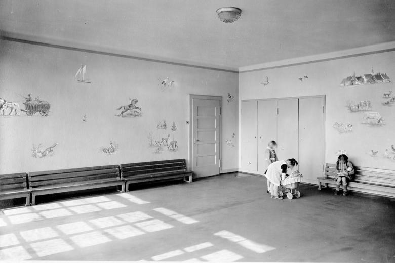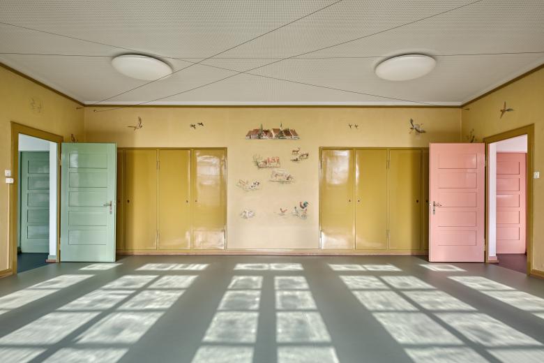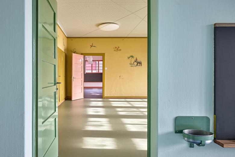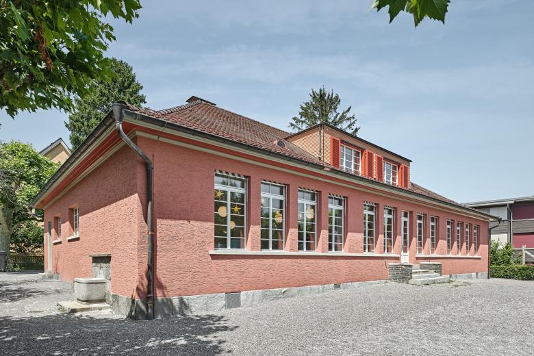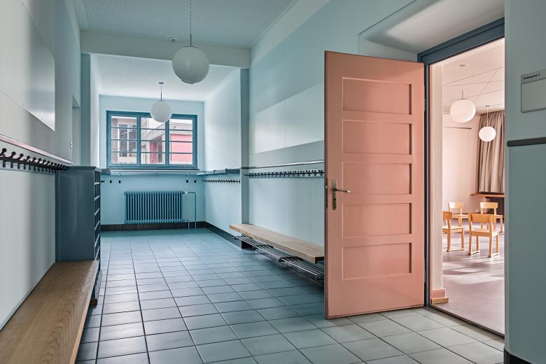 Das von Stadtbaumeister Hermann Herter 1928 erstellte Kindergartengebäude steht in Wollishofen inmitten eines durchgrünten Wohnquartiers. Es ist ein frühes Beispiel für ein eigens für diesen Zweck erbauten Gebäudes auf Zürcher Stadtgebiet und schweizweit. Dies macht das Gebäude typologisch äusserst interessant. Die Instandsetzung fand in engem Austausch mit der Denkmalpflege statt und konzentrierte sich weitgehend auf bauliche Erneuerungen im Gebäudeinnern: So wurden die marode Hourdisdecke im Erdgeschoss ersetzt, die Betonrippendecke des Obergeschosses ertüchtigt, Oberflächen aufgefrischt und erneuert sowie die originalen Wandbemalung mit Tiermotiven im Spielzimmer restauriert. Gleichzeitig wurde die gesamte Haustechnik erneuert, eine neue Heizung eingebaut und die Gebäudehülle mit Aufdopplung der Fenster und neuem Sockelputz ertüchtigt. Ebenfalls wurde der Aussenbereich des Kindergartens in Absprache mit der Gartendenkmalpflege sanft instandgesetzt. Im Obergeschoss wurden Horträume für die ausserschulische Betreuung eingebaut. Schwerpunkt der Instandsetzung ist die neue Farbigkeit der Innenräume. Das Farb- und Materialkonzept beruht zum einen auf historischen Farbbefunden, zum andern auf einer Neuinterpretation von Farbkonzepten der Schweizer Architekturbewegung der 1920er Jahre (Lux Guyer, Hermann Herter): Im Sinne einer "malerischen Promenade" sind die einzelnen Räume farblich differenziert gestaltet und verstärken durch Durchblicke das architektonische Erlebnis der räumlichen Sequenz oder Promenade. Kurz nach unserer Instandsetzung wurde der Kindergarten Farenweg ins Inventar der schützenswerten Bauten von kommunaler Bedeutung aufgenommen.