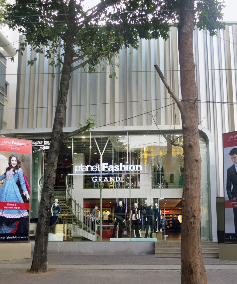 Blocher Blocher India developed and realised an exclusive shop concept – including facade design – for the world-class Planet Fashion flagship store in Bangalore. The retail company offers an enormous collection of fashion ranging from premium Indian and European brands, denim and casual wear to formal apparel and ethical garments. In prime-locations, a unique shopping ambience and excellent customer service are combined. Blocher Blocher India was able to transfer this diversity and quality standards into high-class architecture and an upscale interior design which both deliver an exceptional shopping experience. Four floors, 1.100 square meters retail space, one classy theme A solitary pylon with the Planet Fashion logo on top in front of the building grabs the passersby’s attention. Then, the new facade with affixed metal strips and striking lateral lighting catches the eye and a marvellous shopping trip is anticipated. A glass cube attached to the back of the building stands for transparency and openness. The continuous ceiling element picks up the metal theme of the facade and by this, links in- and outside. The glazed entrée ranges over two levels and a curved stairway leads up to the first floor. Lounging zones offer the opportunity to rest and get inspiration from the surroundings which amaze with a clear colour scheme. The interior design impresses with variations of grey, beige and cream tones as well as dazzling white walls. To ensure orientation, there are room dividers. These are arranged differently from level to level in order to create various areas and feelings. However, the floors remain stylistically connected and the overall impression is sustained – thanks to the puristic colour range. Blocher Blocher India created a diverse but still consistent flagship store.