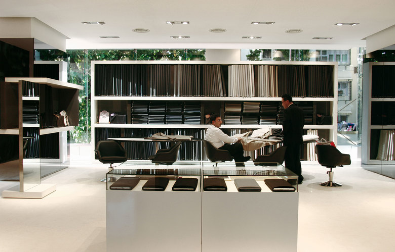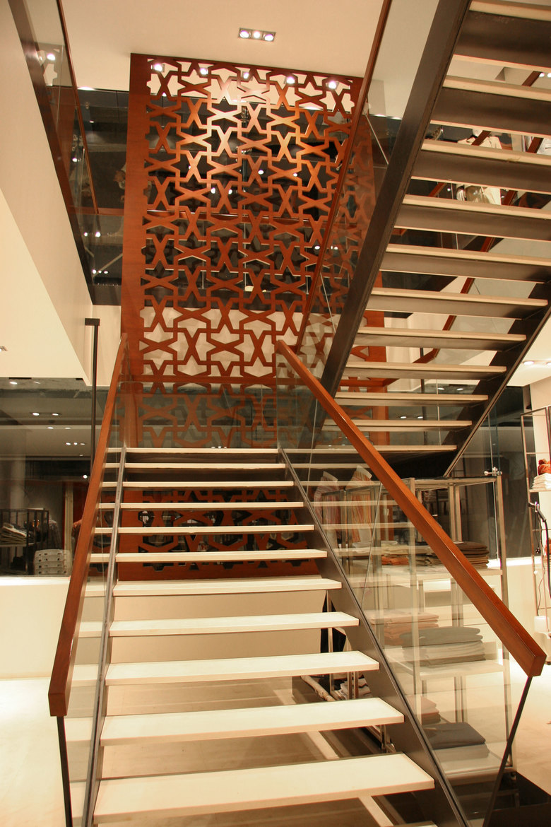 Modern materials and traditional forms, warm colours and cool glass, high gloss, stainless steel and leather are the statements made by the umbrella brand. Indian ornaments are interpreted in two different ways: progressively within a back lighted corpus produced by a milled corean structure in the tailoring services and as classic wood carvings along the staircase. The design concept is surrounded not only by the Colorplus, Parx, Park Avenue (ground floor) and Manzoni (first floor) sub-brands, but also by the tailoring services (first floor). The various interpretations of the topics lend the brands simultaneously their unique individual statements.