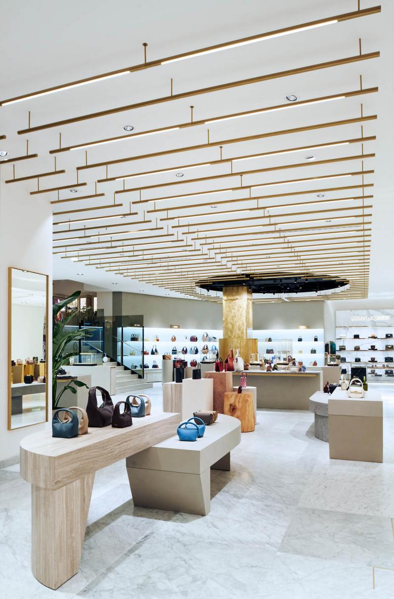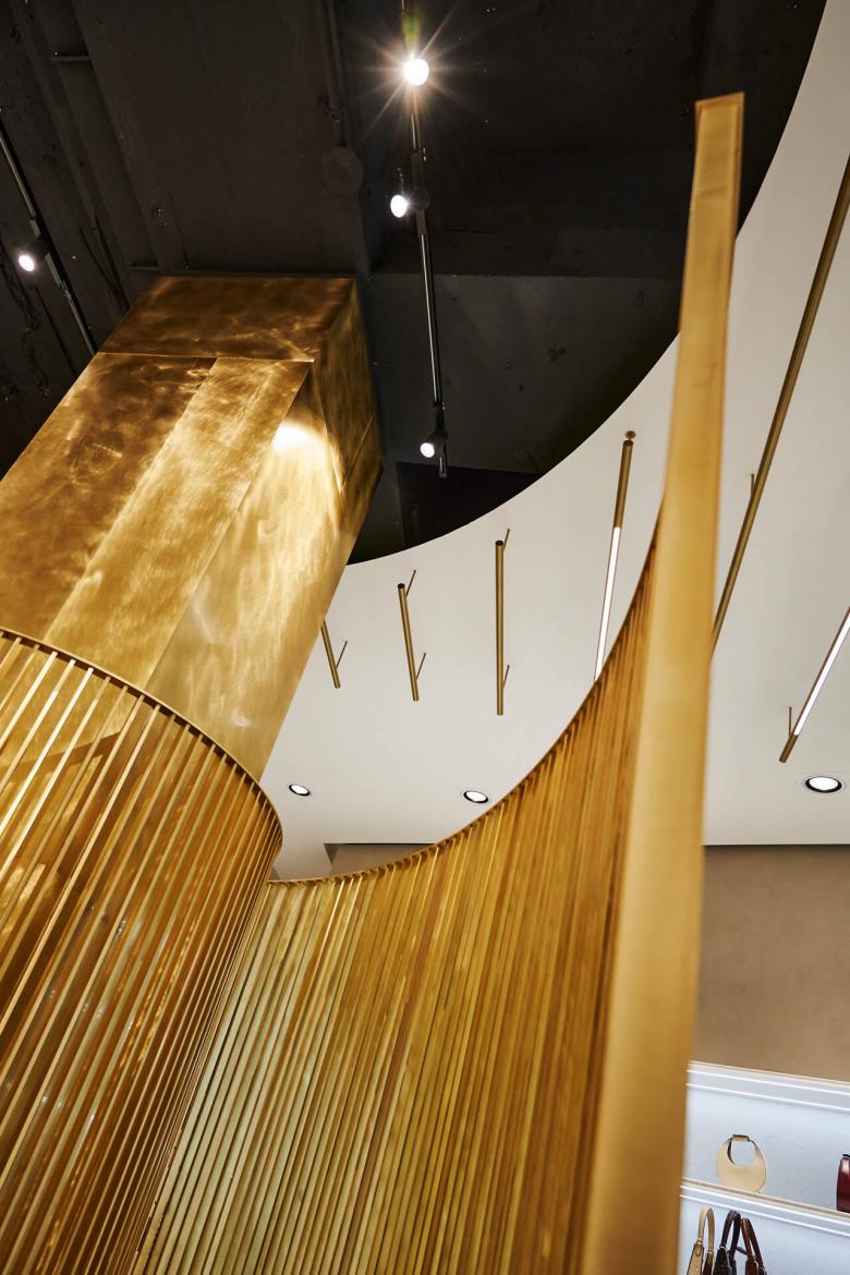Als klare Linie zieht sich das Messing durch das gesamte Interior Design und findet sich so auch in zarten Lisenen im Boden und an den Decken wider: Lange schmale LED-Lichtbänder, die unterhalb der Decke abgehängt wurden, führen von einer Raumseite zur anderen und setzen einen horizontalen Konterpunkt zur vertikalen Warenpräsentation an den Rückwänden.