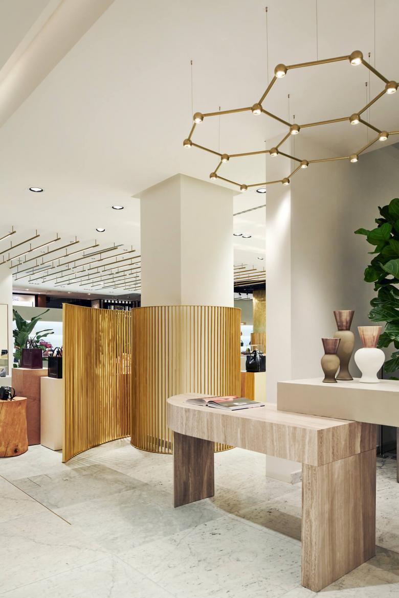 Das Potenzial von Licht schöpfen die Innenarchitekten durch ihre Beleuchtungskuration voll aus: So wurde etwa im rückwärtigen Bereich der Rolltreppe die goldfarbene Favo-Leuchte von Sattler angebracht. In ihrer wabenförmigen Struktur spannt sie ein Netz aus vielen kleinen Lichtpunkten und taucht den Raum dadurch in eine warme Lichtatmosphäre, die vom Natursteinboden sanft zurückgeworfen wird. Trotz der Weite und minimalistischen Gestaltung gelingt den Innenarchitekten mit ihrem Shop-Design der Spagat zwischen luxuriös anmutendem Store für den Breuninger ebenso steht wie für ein exklusives Shopping-Erlebnis in Wohlfühlatmosphäre.