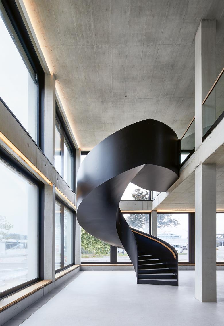 Der freistehende Solitär in Stahlbetonbauweise und einer raumhohen Elementfassade positioniert sich als prominenter Auftakt der zeilenartigen EVF-Häuser entlang der Großeislinger Straße. Den bodenständigen Charakter der EVF widerspiegelnd, charakterisiert eine kompakte, klare Struktur das Gebäude. Die Architektursprache ergibt sich dabei durch ein Spiel mit Dualitäten: Die klare, kubische Struktur des Gebäudes und von Sichtbeton geprägte Flächen im Innern stehen im Kontrast zu weichen Formen wie runden Sitznischen und Countern sowie der Wärme, die sich durch den punktuellen Einsatz von Holz ergibt. Erd- und erstes Obergeschoss verbindet eine skulpturale Treppe, ein mit gelasertem Stahlblech versehener Kern bringt die Werte der EVF – Stärke, Qualität und Verlässlichkeit – zum Ausdruck. Raumhohe Verglasungen verspringen und geben der Fassade Plastizität. Die Kontur des Gebäudes wird im Inneren durch eine indirekte Beleuchtung an der Fassade unterstrichen, zwei orthogonal zueinander verlaufende Lichtachsen leuchten die Sichtbetondecke aus und nehmen die strukturierte Raumteilung auf.