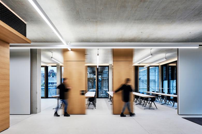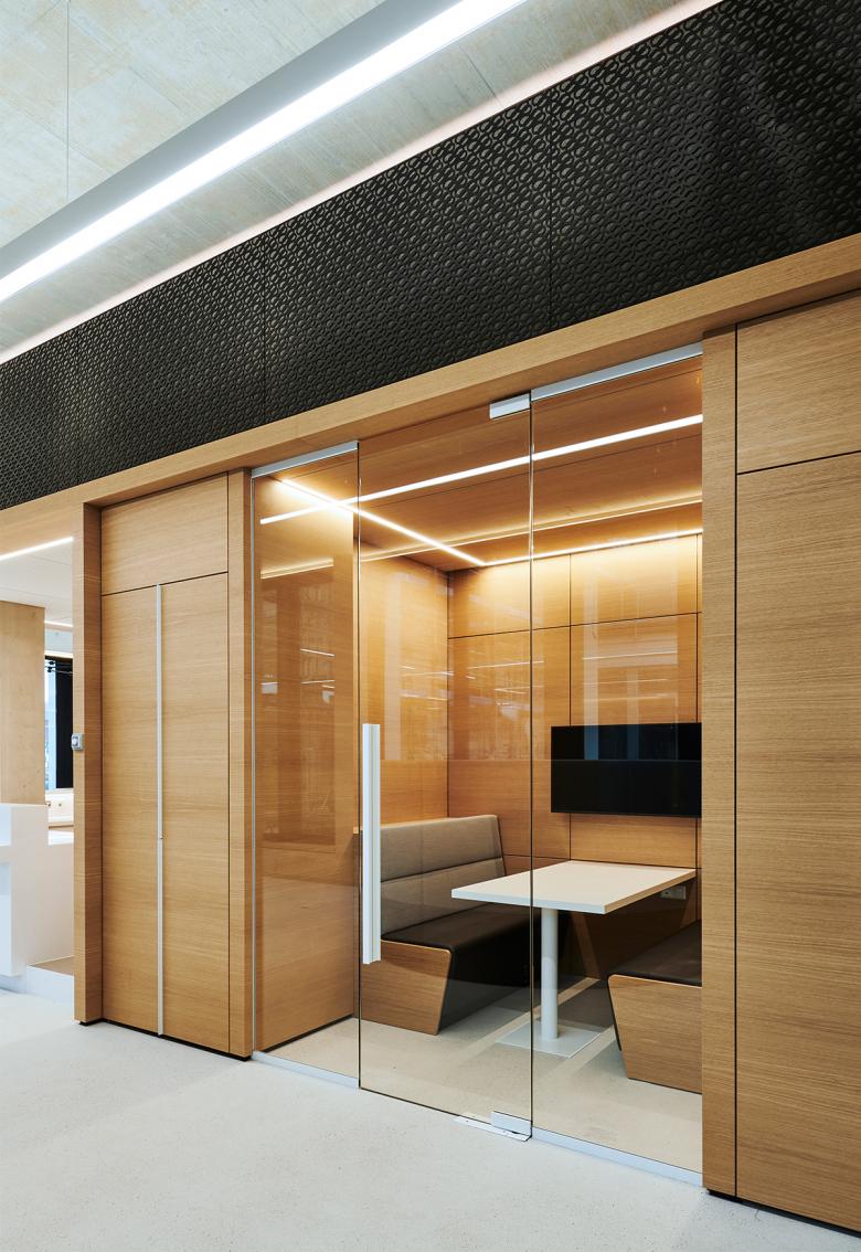 Pure Materialien und dezente Farbakzente spiegeln wie auch im Neubau Rationalität und Sorgfalt wider, lassen die Arbeitswelt weit und gut organisiert erscheinen. Sind die Wände weiß und die Böden in dunklem Teppich gehalten, erzeugen Eichenholzmöbel einen warmen Kontrast. Flexible Wände, die die Räume je nach Bedarf neu strukturieren, ermöglichen mobiles Arbeiten – allein oder im Team. Mit Magneten und Pinboards belegte Wände ermöglichen aktiven Austausch unter den Mitarbeitern und erzeugen Transparenz. Einer der wenigen Farbakzente: ein entsättigtes Grün, das überall dort zum Einsatz kommt, wo Raum für Kommunikation ist – als Wandfarbe im Kasino oder als Treppenzugang zu den Teeküchen.