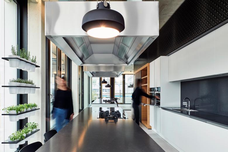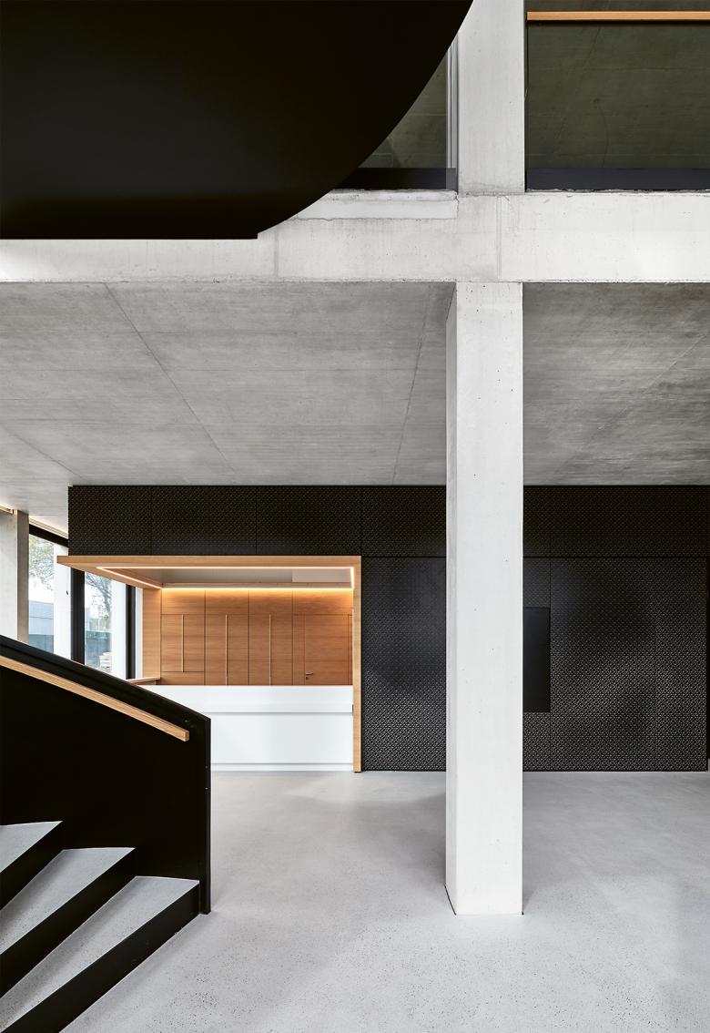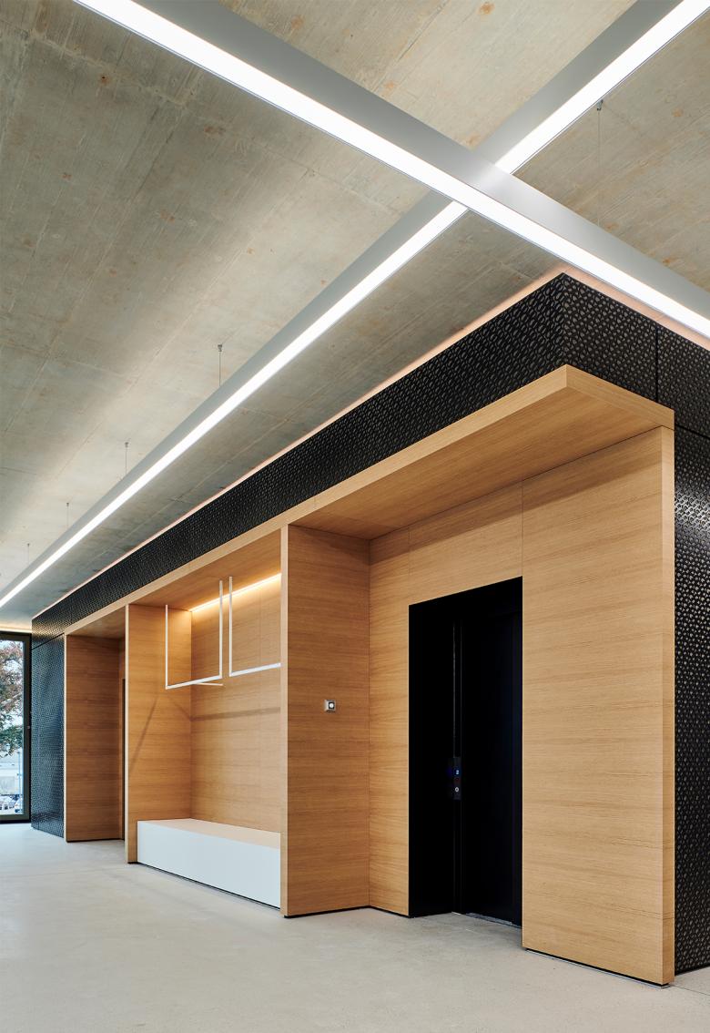 Auch die vorgesetzte Fassade im Bereich des Mitarbeiterkasinos im Erdgeschoss sucht die Nähe zum Neubau: Gleich einer Klammer verbindet sie sich in ihrer Materialität mit dem schwarzen Eloxal der Fenster des gegenüberliegenden Gebäudes. Eine fast wohnliche Atmosphäre wird im Innern durch Kräutergärten an den Fensterfronten erzeugt, die darüber hinaus als Sichtschutz fungieren. Sitzbänke in einem kräftigen Aubergine-Ton harmonieren mit den Eichenholzmöbeln und den schwarzen Pendelleuchten. Durch das Feingefühl der Planer präsentieren sich Neu- und Altbau nun als Einladung für die Kunden und als Versprechen einer hohen Aufenthaltsqualität für die Mitarbeiter.