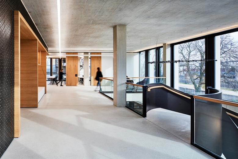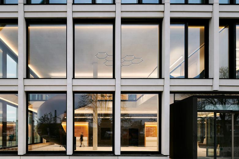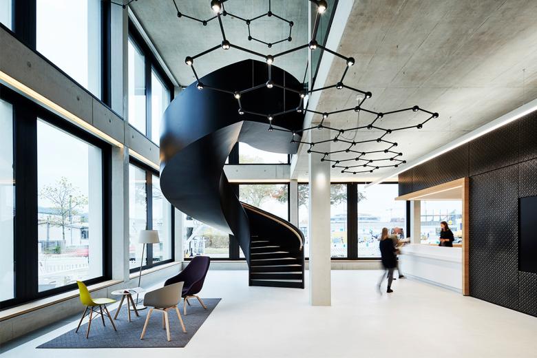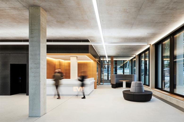 Obgleich die Büroräume in den Obergeschossen geschlossener gestaltet sind, fördern sie interdisziplinares Arbeiten sowie die interne Kommunikation und erhöhen dadurch die Aufenthalts- und Arbeitsqualität. Dem Bestreben der EVF nach ständiger Weiterentwicklung – nach Innen und Außen – wird Rechnung getragen, indem die Bürogrundrisse flexibel gehalten sind. Strukturelle Veränderungen können so jederzeit auch räumlich umgesetzt werden. Verbindendes Element des Erd- und ersten Obergeschosses ist die Favo-Leuchte, die sich in drei Ebenen im Luftraum ausbildet und die Ausstellungsfläche im Erdgeschoss beleuchtet. Das innovative Beleuchtungssystem von Sattler Lighting wurde bereits mit mehreren Awards ausgezeichnet.