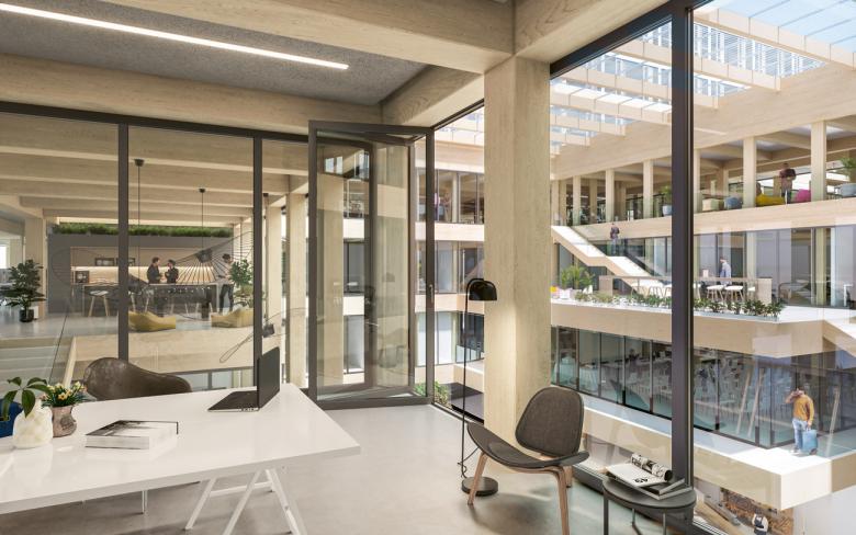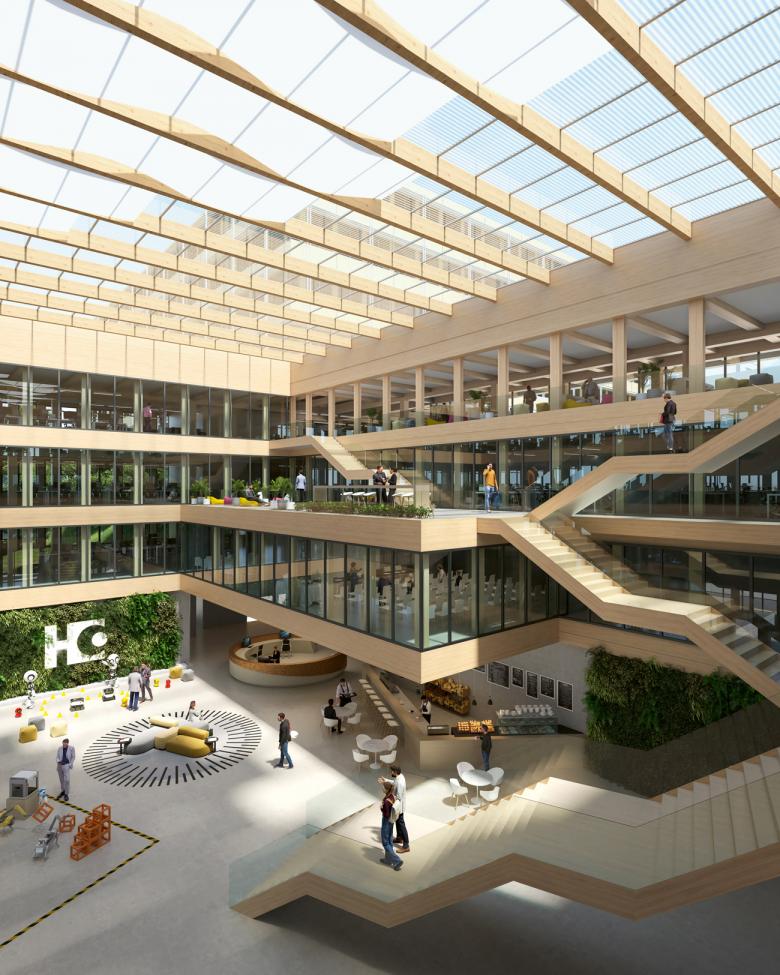 Die Gebäude werden Maßstäbe im Bereich der nachhaltigen Architektur setzen. Bis auf die erdberührenden Elemente und die Gebäudekerne ist die gesamte Gebäudestruktur als Holzskelettbau mit Brettsperrholzdecken ausgeführt. Auf diese Weise ist der Vorfertigungsgrad hoch und der Rückbau wird bereits im Entwurfsprozess berücksichtigt. Ziel ist es, während des gesamten Baus nach Cradle-to-Cradle-Standards zu planen.