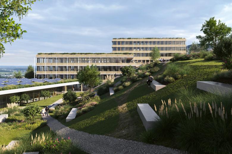 Das innovative Bürogebäude zeichnet sich durch zwei sich überschneidende Höfe aus, die in die Topographie integriert sind und eine durchgehende Verbindung zwischen dem oberen Teil des Campus, in dem sich das Hauptwerk befindet, und dem unteren Teil, in dem sich die neue Hauptadresse des Campus befinden wird, bieten. Dadurch werden alle Mitarbeiter auf einem integrierten Campus mit Blick auf den umliegenden Schwarzwald arbeiten.