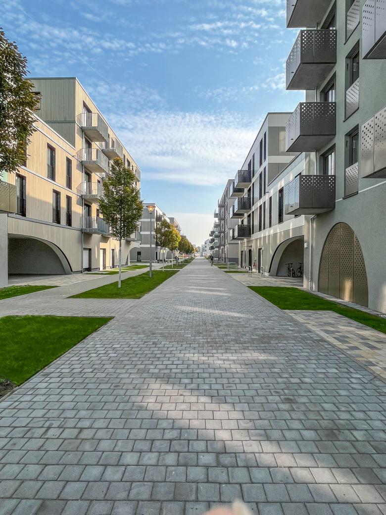 Intention war, ein städtebaulich und freiraumplanerisch anspruchsvolles Ensemble zu schaffen und mit einer modularen, standardisierten Bauweise eine ansprechende und dennoch wirtschaftlich optimierte Architektursprache zu formen. So wurde ein ganzheitliches Quartier entwickelt, das unterschiedliche Bevölkerungsschichten anspricht und eine lebendige, soziale und altersdifferenzierte Durchmischung der Bewohner garantiert. Nur wenige, vorab definierte Module und eine geringe Anzahl an Materialien kommen zum Einsatz, die durch variantenreiche Kombination Fassaden mit einem vielfältigen und identitätsstiftenden Erscheinungsbild entstehen lassen. Maxime der Planung war »Qualität bezahlbar zu machen« – dafür optimierten die Architekten die Strukturen von der Statik bis ins kleinste Detail und gestalten ein Ensemble, das vielfältigen öffentlichen Raum für Begegnungen und Kommunikation bereithält.
