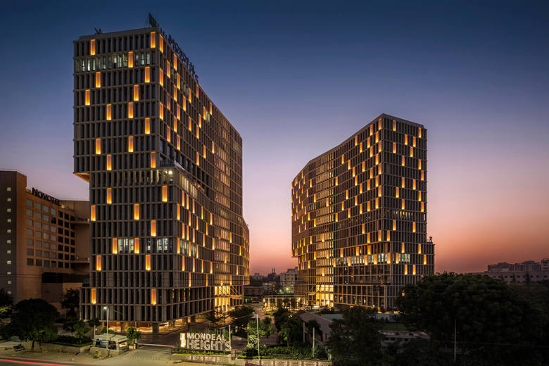 blocher partners india plante eine Business-Landmark am Sarkhej Gandhinagar Highway im indischen Ahmedabad. Der exklusive Mix aus urbaner Struktur und höchsten Ausstattungsansprüchen bietet einen Hafen für die moderne Geschäftswelt Indiens. Die rund 70 Meter hohen Zwillingstürme beherbergen neben großzügigen Büros und Konferenzräumen auch ein Casino und ein exklusives Club House mit Fitnesscenter und Wellness-Bereichen. Die Baukörper selbst spielen mit Zwischensprüngen und verschobenen Elementen, die urbane Dynamik zelebrieren. Die Fassade: ein Raster aus offenen, halbtransparenten und geschlossenen Rechtecken. Je nach Tageszeit wirft die Sonne unterschiedliche Schattenbilder auf die Gebäudehülle und lässt sie lebendig wirken. Durch das vielschichtige Design verspricht das Ensemble schon von Weitem Exklusivität. Mit den Mondeal Heights entsteht ein Businesscenter von internationalem Rang, das einen neuen Akzent in der 6-Millionen-Einwohner-Metropole setzt.