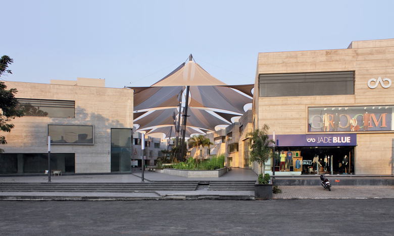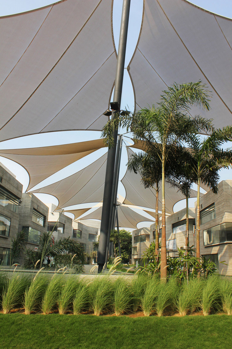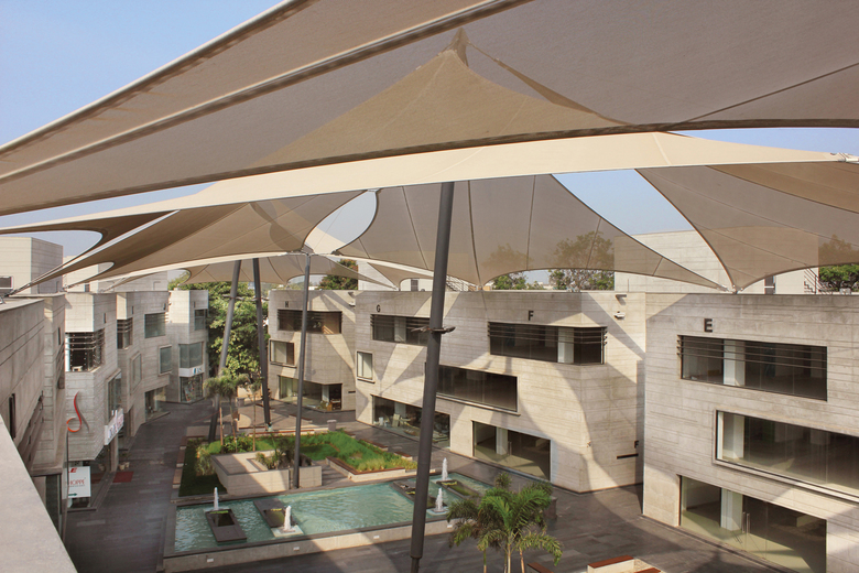 Der Retail Park bietet mit 16 separaten Einheiten jedem Unternehmen eine individuelle Adresse. Ein Anreiz für die indischen Premiumbrands, die ihre Stores ganz an eigene Ansprüche und Bedürfnisse anpassen können. Ganz abgesehen davon, dass das Ensemble zu den Toplocations der Stadt gehört – allein durch seine Lage, aber auch durch sein städtebauliches Konzept mit Mehrwert. Denn die Gebäude gruppieren sich um eine zentrale Plaza, in die Wasserspiele und Grünflächen eingebettet wurden, sanft beschattet von großformatigen Segeln. Gerade in den Sommermonaten eine Oase für die hitzegeplagten Städter - und ein vortrefflicher Anlass, den Einkaufstrip gleich mit einer Auszeit im Grünen zu verbinden.
