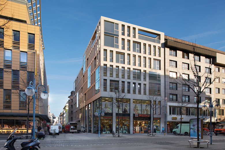 Das mischgenutzte Gebäude P3 ist mit seinen 7.200 Quadratmetern ein wichtiger Baustein in Mannheims Innenstadt – in Form und Funktion. Ein Bauwerk, das das Angebot auf den Planken perfekt ergänzt. Neben Verkaufsflächen entstanden vier Geschosse mit Büros und Wohnungen inklusive Terrassen im Staffelgeschoss. Die Fassade wird durch die Geschossdecken und die Fassadenstützen mit ihren unterschiedlichen Rasterabständen bestimmt. Die massive Gitterstruktur aus hellem (Schönbrunner) Main-Sandstein interpretiert die stadtbildprägende Lochfassade neu. Die zweigeschossige Schaufensterfassade schafft Transparenz auf den Handelsflächen. Das Gebäude schließt ein für Mannheim typisches Quadrat und schafft damit zugleich eine attraktivere Innenhofsituation.