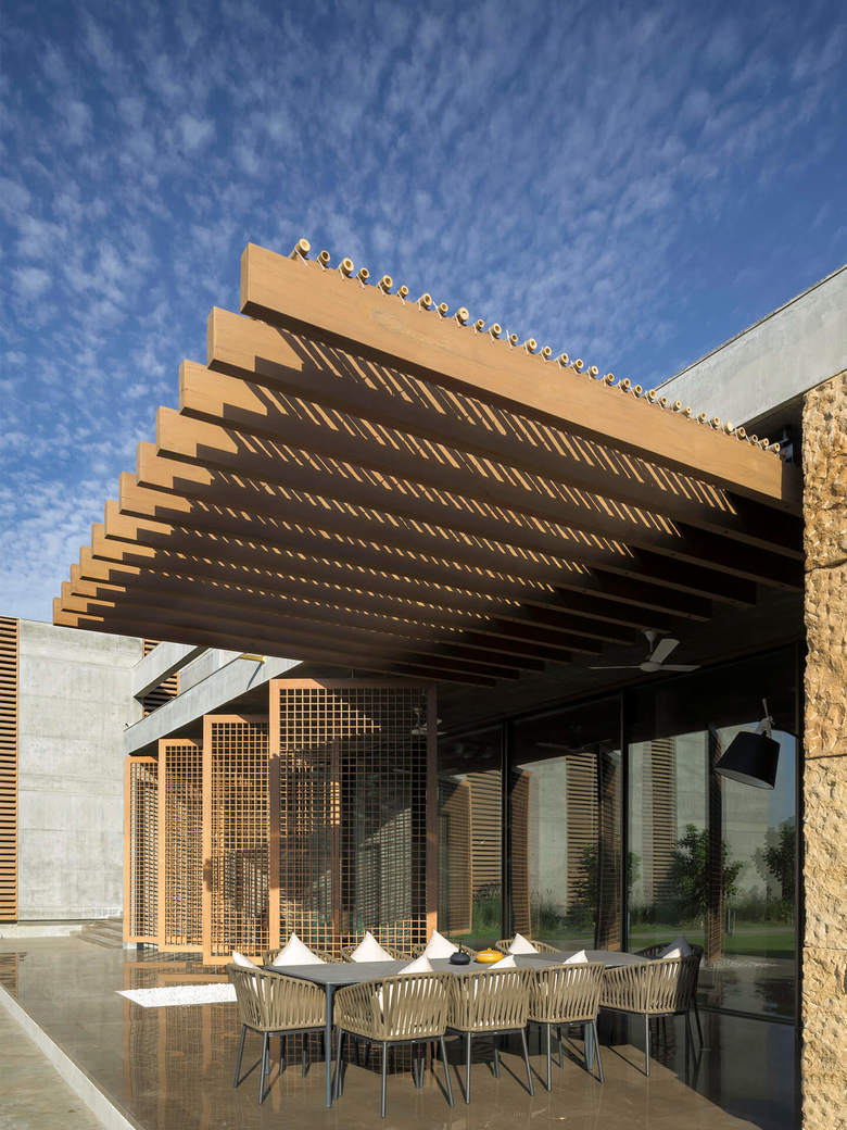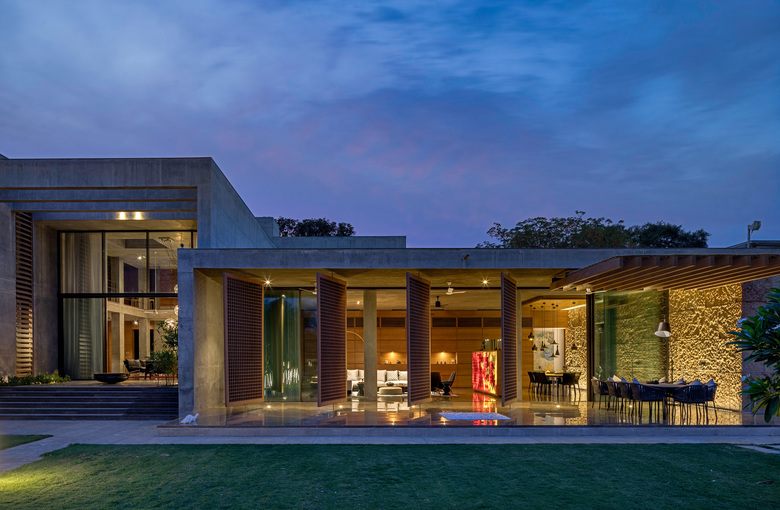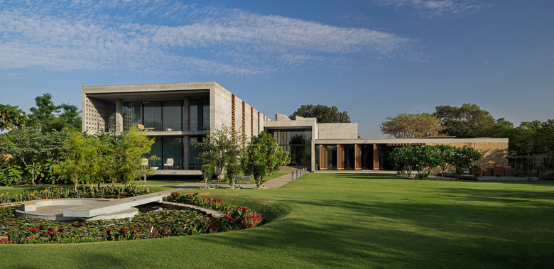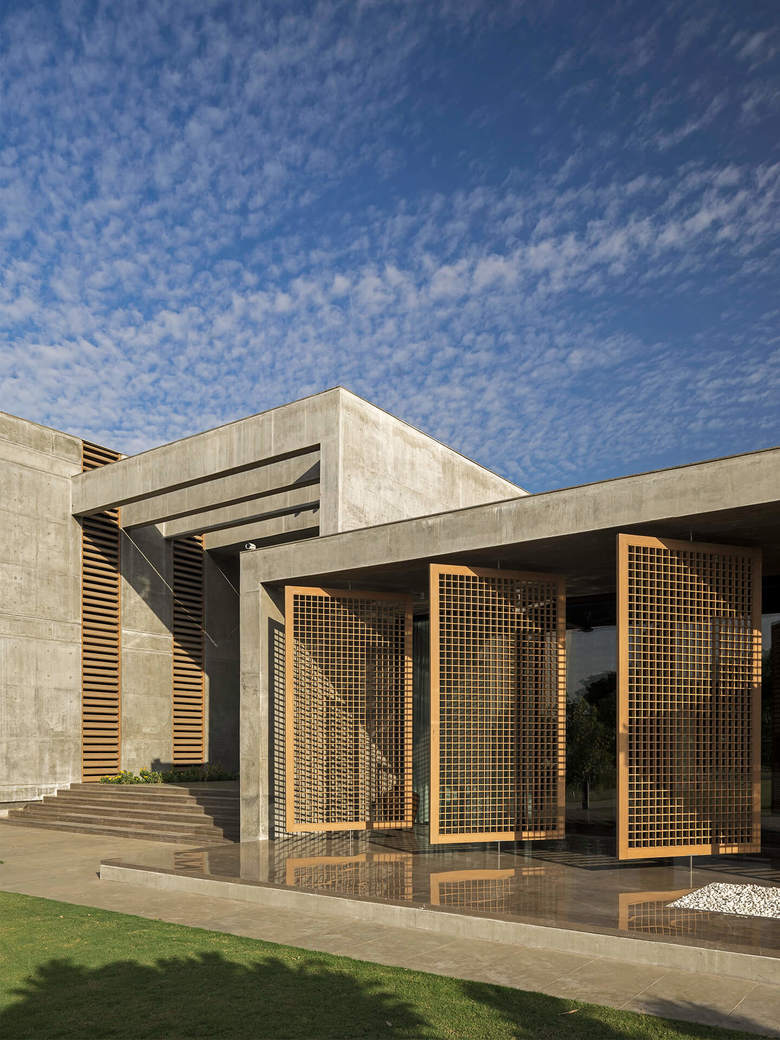 Im Stadtteil South Bopal am westlichen Rande der indischen Millionenstadt Ahmedabad, dem vitalen Zentrum des sich rasant entwickelnden Bundesstaates Gujarat, bauten die Architekten für eine Unternehmerfamilie ein außergewöhnlich atmosphärisches Zuhause. Lage, Grundriss und Nutzung der einzelnen Räume der Villa mit einer Wohnfläche von 1.800 Quadratmetern leiten sich aus den indischen Lehren ab.
