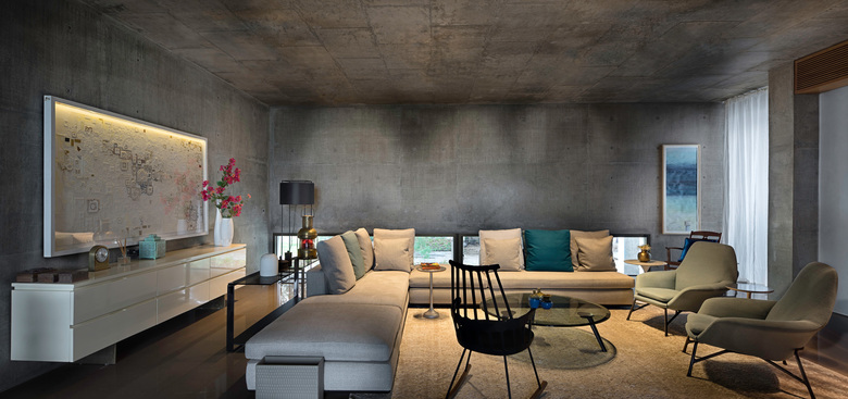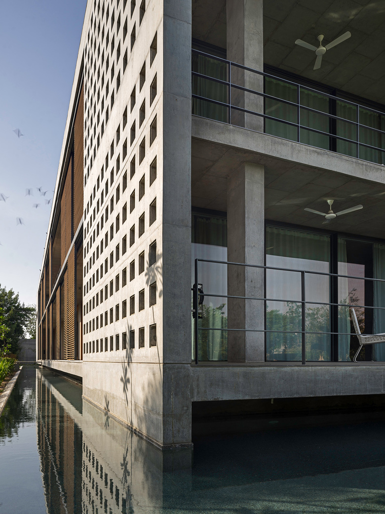Eingerichtet sind die Räume im zurückhaltenden, minimalistischen Stil. Das von den Architekten entwickelte Einrichtungskonzept kombiniert dabei moderne italienische mit traditionell indischen Möbeln – einzig die hochwertige Küche ist ein deutsches Produkt. Teile der Möblierung wurden vom Team der Innenarchitekten selbst entworfen und von ansässigen, indischen Handwerkern produziert.