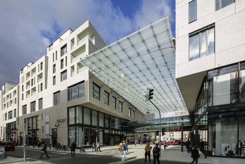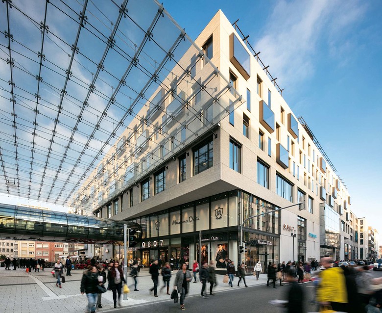 Das Architekturbüro blocher partners entwirft mit dem multifunktionalen Stadtquartier Q 6 Q 7 eine vertikale Stadt aus Gastronomie, Gewerbe, Freizeitangebote, Wohnen und einem Hotel. Im Herzen von Mannheim ist so ein lebendiges, urbanes Quartier mit vielseitiger Nutzung und hoher Aufenthaltsqualität entstanden. Die Architektur integriert das Neubau-Ensemble sensibel in das städtebauliche Umfeld. Verschiedene Zugänge sorgen für eine konsequente Vernetzung innerstädtischer Wege. Harmonisch und zugleich selbstbewusst fügt sich Q 6 Q 7 mit diesem offenen Konzept ins traditionelle Stadtbild. Von Anfang an ging es den Architekten und Stadtplanern um mehr als eine Mall im Zentrum von Mannheim, ihnen schwebte ein urbaner Kristallisationskern vor, der auch nach Ladenschluss belebt ist. Dazu nutzte das Architekturbüro die besondere Topographie Mannheims, dessen Quadratraster an der Grenze der ehemaligen Stadtmauer von einem Kreisbogen geschnitten wird. Unter einem großen Glasdach und einer transparenten Verbindungsbrücke spannt sich ein neuer Stadtraum auf. Er verbindet zwei korrespondierende Häuser und damit auch die Quadrate Q 6 und Q 7, die ihrerseits das Wegenetz zwischen Kunststraße und Fressgasse erweitern und stärken.