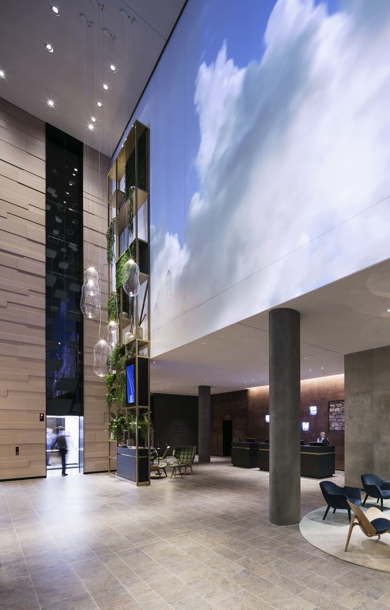 Quasi als »Stadtgarten« inszenierten die Gestalter das Entree, die Visitenkarte des Hotels. Der Gast erlebt die über drei Stockwerke geöffnete Empfangshalle als sehr großzügig, modern und urban. Fast raumhohe, üppig begrünte Regale und bis zu ein Meter hohe, mundgeblasene Glasleuchten verleihen dem Raum eine Aura der Leichtigkeit und Wohnlichkeit.