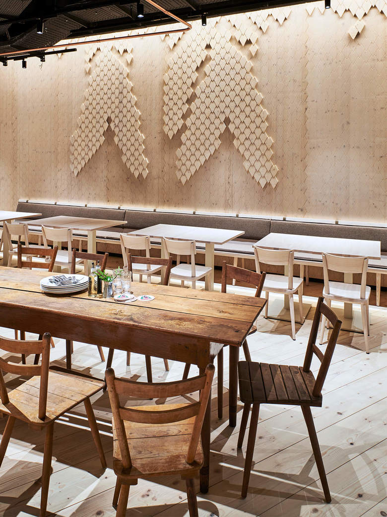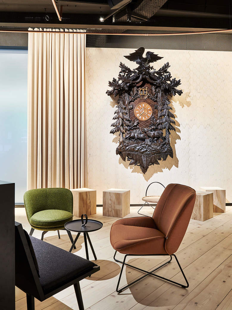 Als weiterer optischer Hingucker fungiert eine riesige dunkelbraune Kuckucksuhr. Den mystischen Charakter unterstreichen die von Hand geräucherten, schwarzen Schindeln, die im Bar- und Loungebereich an der Decke verzahnt sind. Über dem Gastraum gibt die offene Decke den Blick frei auf eine gestaltete Installationsebene. Helle Schindeln aus Fichtenholz machen die Wände – teilweise in abstrakter Form von Tannenzapfen – unverwechselbar. Geweißtes und geöltes Tannenholz formt den massiven Dielenboden. Den Gegensatz zwischen dunkel und hell thematisiert auch die emotionale Lichtgestaltung. Der bekannte Offenburger Künstler Stefan Strumbel interpretiert in den Sanitärbereichen mittels kaleidoskopischer Darstellungen traditionelle Schwarzwaldmotive auf moderne Art neu.