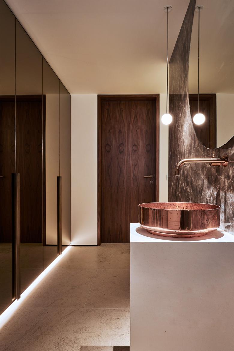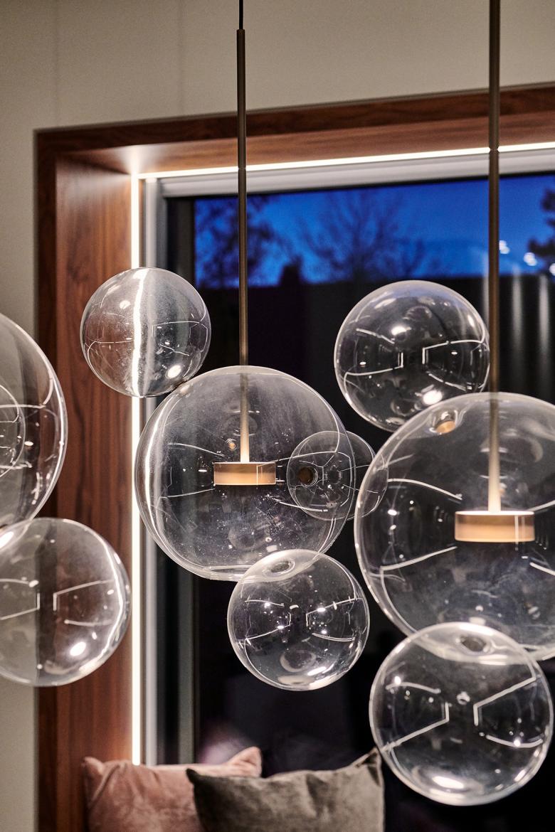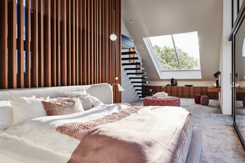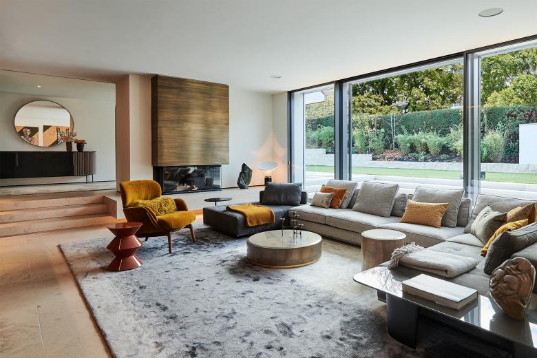 Untermalt wird dieser Effekt durch die bodentiefe Vollglasöffnung im Wohnzimmer, die eine beeindruckende Verbindung zwischen Innenraum und Außenbereich schafft. Die beinah durchgängige Fensterecke im Esszimmer nimmt den Bezug ebenfalls wie selbstverständlich auf. Unmittelbar schließt sich die Küche an, deren freistehende Konzeption die offene Gestaltung unterstützt und so Raum schafft für Kommunikation. Für Gäste kaum wahrnehmbar, verstecken sich hinter einer deckenhohen Bibliothekswand im Eingangsbereich weitere Räumlichkeiten, die als private Rückzugsorte für die Bauherren konzipiert sind. Zwar sind sie ebenfalls großflächig verglast, erwecken aber durch ihre Größe und geschlossene Form eine intime Atmosphäre.
