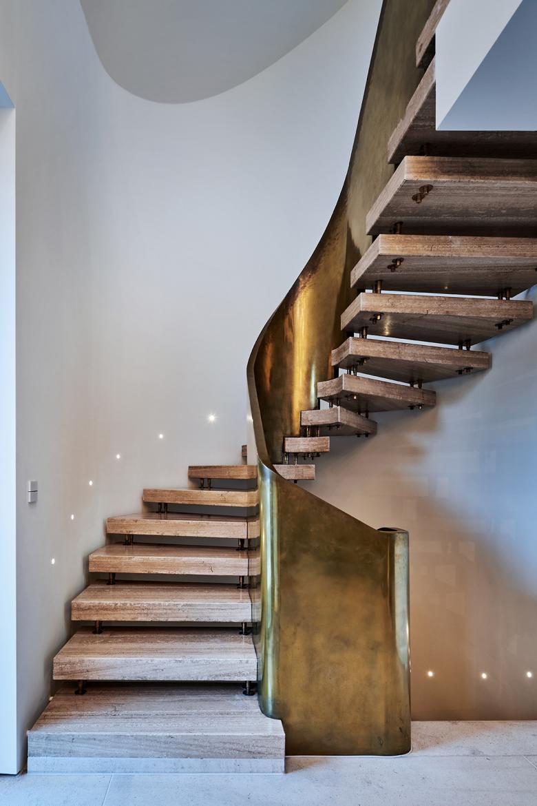Die teilweise verschachtelten Räume haben die Innenarchitekten von blocher partners deshalb weitgehend geöffnet. Wie aus einem Guss reihen sich Küche, Ess- und Wohnzimmer aneinander, der offene Wohnraum im Erdgeschoss säumt einen Gebäudekern aus edlem Nussbaum, hinter dem sich eine Treppe sowie Aufbewahrungsmöglichkeiten befinden.