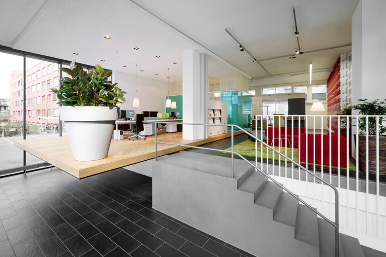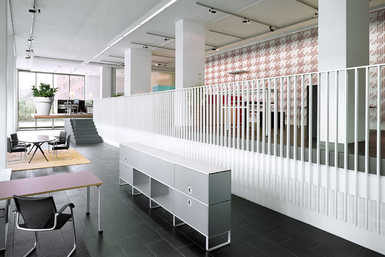 Das Raumkonzept von Bureau Hindermann verbindet die zentralen Bereiche Ausstellen und Arbeiten miteinander. Im Arbeitsbereich herrscht durch die Materialisierung und das Licht eine nahezu wohnliche Atmosphäre vor. Der überdimensionale Blumentopf mit dem Gummibaum ist nicht nur eine augenzwinkernde Reminiszenz an die einst beliebteste Zimmerpflanze, sondern vor allem ein optischer Anziehungspunkt für die Kundschaft. Das Ziel des Entwurfes für Gräub Office war es, über die rein funktionalen Anforderungen, wie persönliche Besucherführung, grosse Ausstellungsflächen, stimmungsvolle Arbeitsplätze und flexible Nutzungsmöglichkeiten hinaus starke, unverwechselbare Bilder und Eindrücke zu vermitteln, die auch im Nachhinein mit Gräub Office in Zusammenhang gebracht würden. Dazu tragen das Schaufenster mit der Büroleuchteninstallation, die überdimensionale Zimmerpflanze sowie die Wand mit den 25'000 Bürogummis bei.