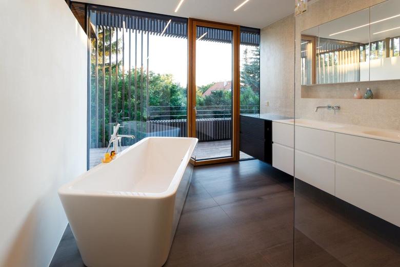 Die eher introvertiert erscheinende Box mit Schlafräumen im Obergeschoß scheint über der Wohnebene mit vorgelagerten Balkonen zu schweben. Der multifunktionale Raum im Dachgeschoß, als zurückversetzte ebenfalls geschlossen wirkende Box, wird vom Garten kaum wahrgenommen und schafft so Intimität und einen Rückzugsbereich.