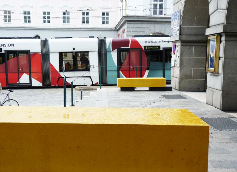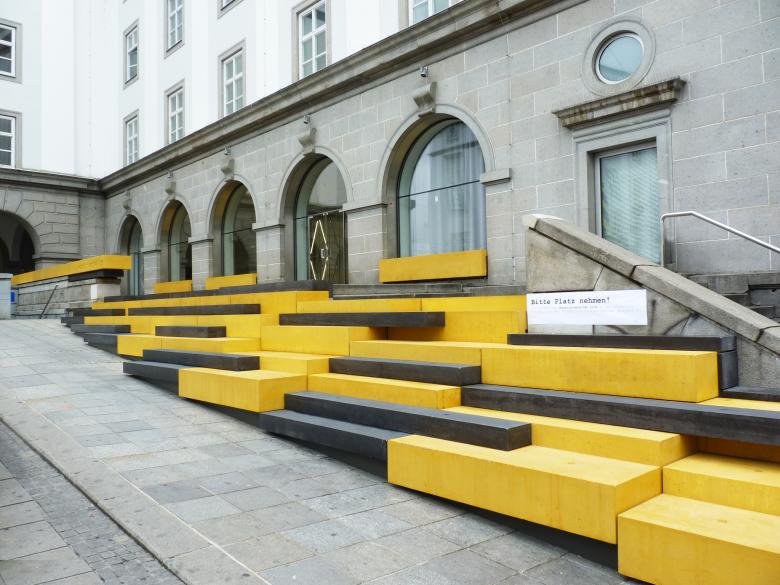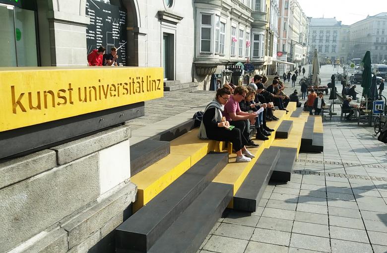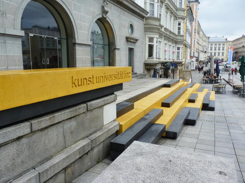 Rund 60 farbige Betonquader in den Farben Schwarz und Gelb zieren den Vorplatz der Kunstuniversität Linz am Hauptplatz. Von „Caramel Architekten“ entworfen, soll das Geschenk der Kunstuniversität Linz an alle LinzerInnen zum Verweilen einladen und gleichzeitig die Sichtbarkeit der Ausbildungsstätte im urbanen Raum stärken. Inspiriert von den temporären Sitzstufen an gleicher Stelle bei „Linz 09“, damals ebenfalls aus der Feder von Caramel, soll diese neu entstandene Form der Stadtmöblierung die Kunstuniversität Linz sowie das „splace am Hauptplatz“ zum Hauptplatz hin öffnen – und umgekehrt.