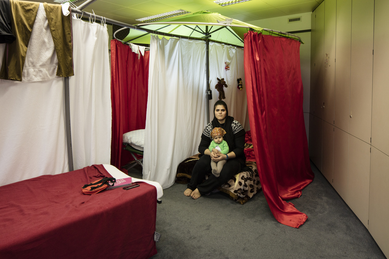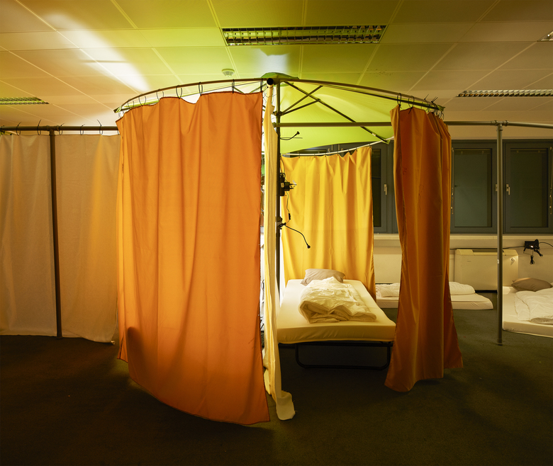 Erster persönlicher Rückzugsbereich nach Monaten auf der Flucht und der Unterbringung in Massenlagern. Selbstgewählte Grundrissgestaltung des eigenen Wohnumfeldes. Individuelle Lichtatmosphäre durch die eigene Klemmleuchte und die räumliche Abschirmung gegen die Bürorasterleuchten der Bestandsdecke.