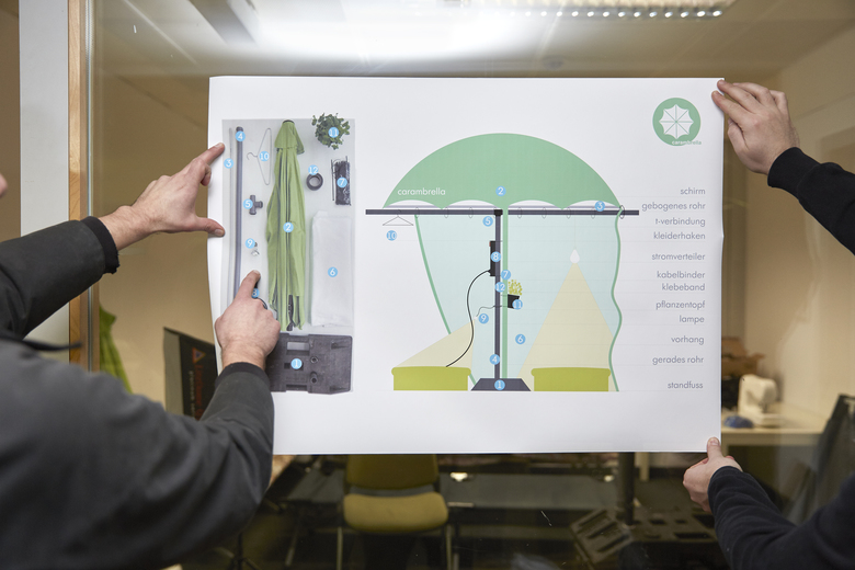 Für 280 Flüchtende wurde in einem vorübergehend leerstehenden Grossraumbürogebäude mit Materialkosten von 50 € pro Person und einer Aufbauzeit von 50 Minuten pro Person individuell aneigenbare Privatsphäre geschaffen. Aus den günstigen ready-made Produkten Sonnenschirm, Bauzaunständer, Elektroleerrohren, steckbaren Kunststoffwasserrohren,
