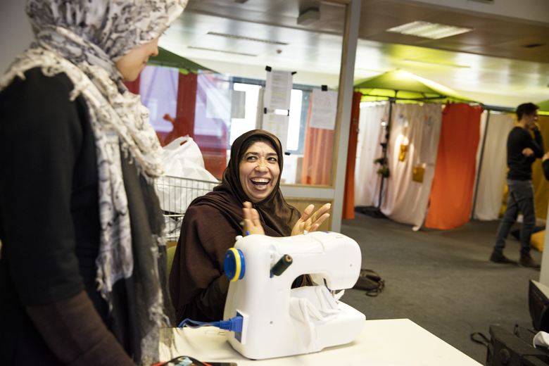 Vorhangstoff, Kabelbindern, Klemmleuchte und Verlängerungssteckdose entwickelten Caramel Architekten eine prototypische Raumstruktur, deren Aufbau den Flüchtenden vor Ort vorgestellt wurde. Direkt im Anschluss daran nahmen die Kinder, Frauen und Männer die Raumstruktur zum Probewohnen in Besitz und begannen mit den bereitgestellten Nähmaschinen erste Stoffbahnen zu Vorhängen umzunähen. In gemeinschaftlicher Arbeit wurde dann ein Grossraum nach dem anderen von einem offenen Matratzenlager zu Wohnungen mit individuell an die jeweilige Bewohnerkonstellation angepassten Raumstrukturen aufgebaut ( Kleinfamilie, Grossfamilie, Wohngemeinschaft).