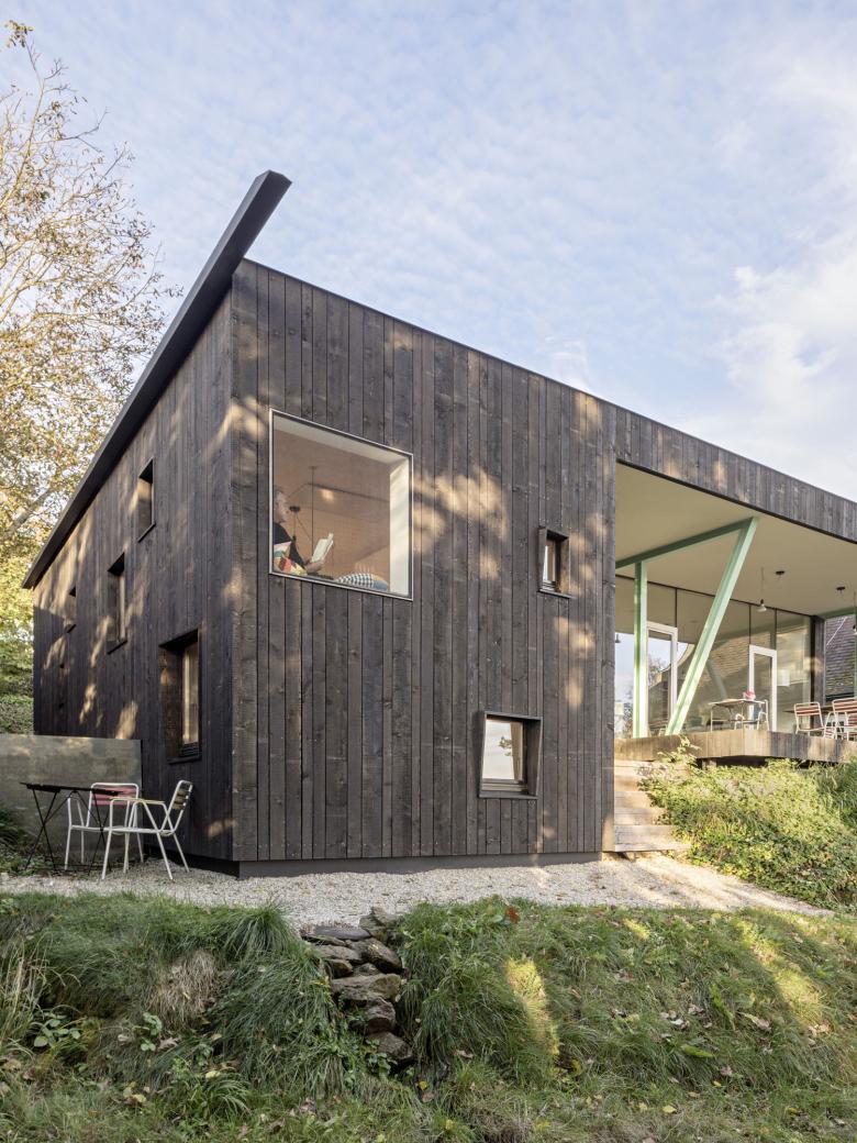 Auf der Straßenseite orientiert sich das Haus an den Nachbarhäusern mit ortstypischen Satteldächern, interpretiert das Dach jedoch als teilweise überdachten Außenraum neu. Dort wirkt das große Einfamilienhaus zurückhaltend und fügt sich in die Tektonik der Straßenfronten der Nachbarhäuser ein. Zum Garten hin wächst das Haus jedoch imposant aus dem Hang heraus und öffnet sich zur Landschaft.