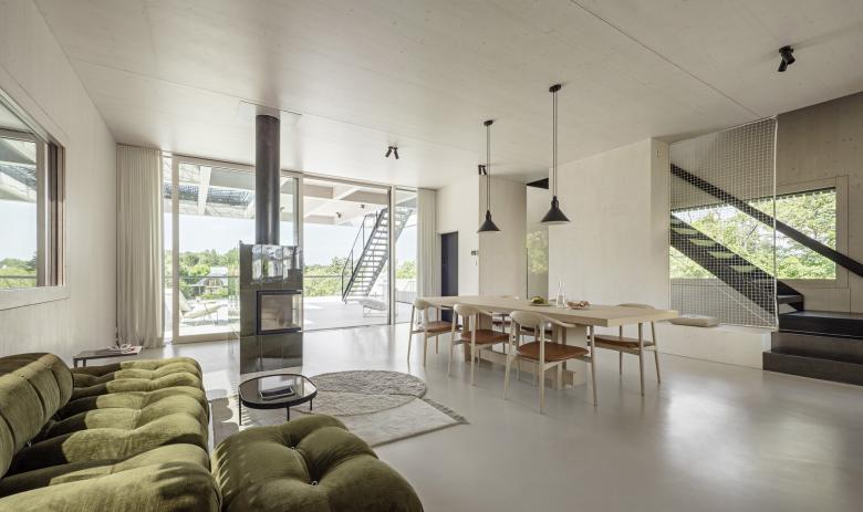 Die interne offene Treppe, die vom Studio bis zur obersten Etage führt, wird von einem offenen Glasaufzug begleitet. Im Obergeschoss liegt der Ess-, Küchen- und Wohnbereich, der sich zur Gartenseite hin zu einer großen, teilweise überdachten Terrasse mit Blick in Richtung Perchtoldsdorfer Heide öffnet. Eine Außentreppe führt direkt in den Garten mit Pool und Gästehaus. Zur Straße hin liegt der Küchenbereich mit einer versteckten Vorratsküche und einer Frühstückstheke.