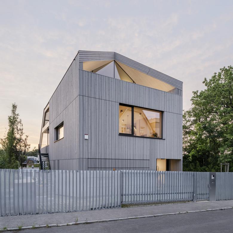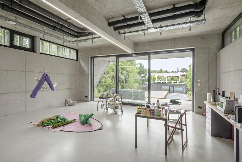 Um der Hektik der Wiener Innenstadt zu entfliehen, wünscht sich eine vierköpfige Familie ein Domizil im Grünen, in dem auch ein großzügiges Künstleratelier untergebracht werden soll. Man findet den perfekten Hangplatz. Die Beschaffenheit des Grundstücks lädt förmlich zur Stapelung der unterschiedlichen Wohnwelten ein. Dadurch entsteht im Untergeschoss das 3 Meter hohe Künstleratelier, teils an den Hang geschmiegt, teils auf gleicher Höhe mit dem Garten. Die überdachte Terrasse wird auch als Außenstudio genutzt.