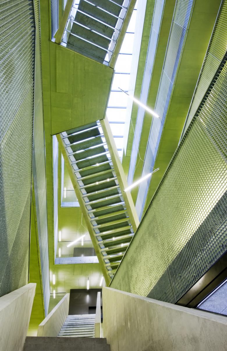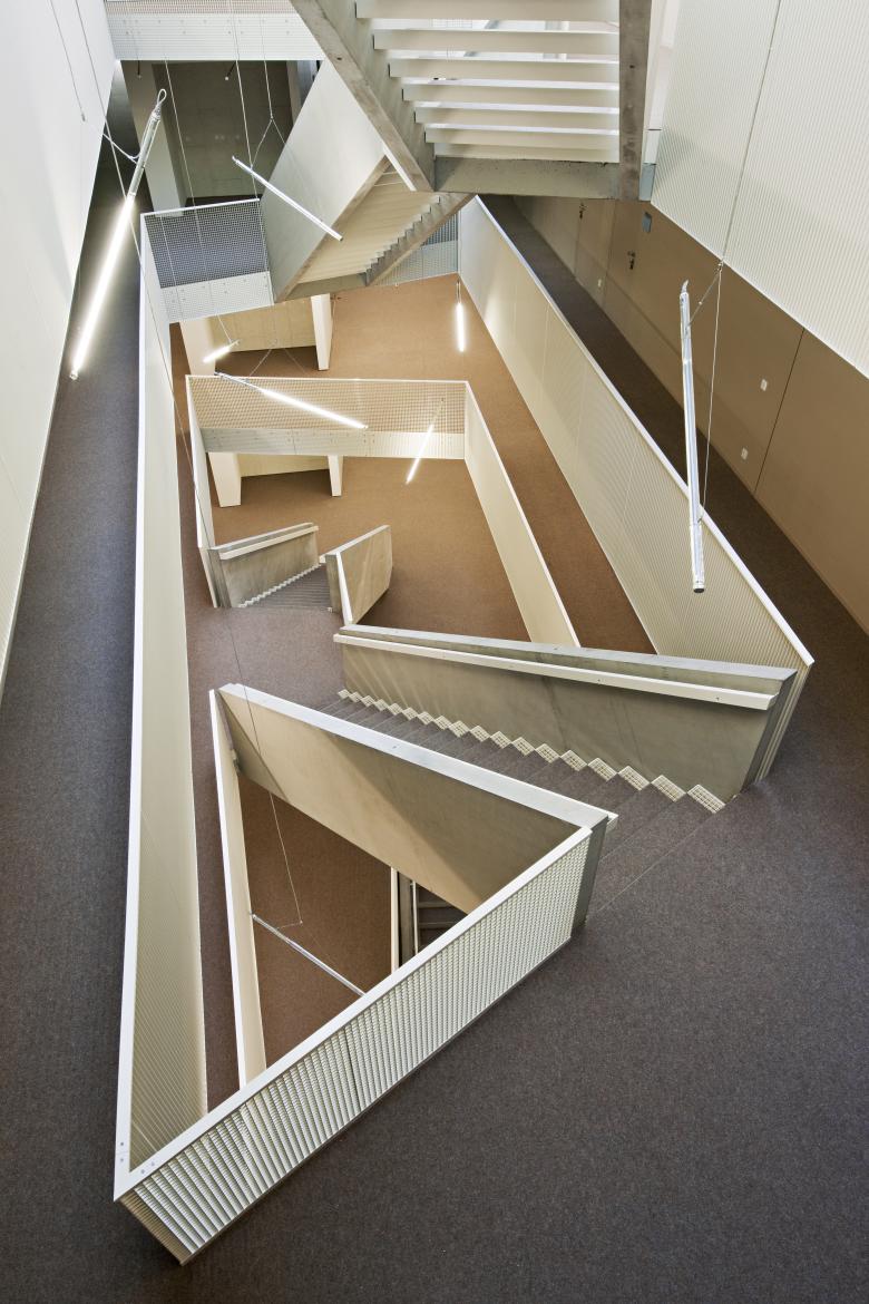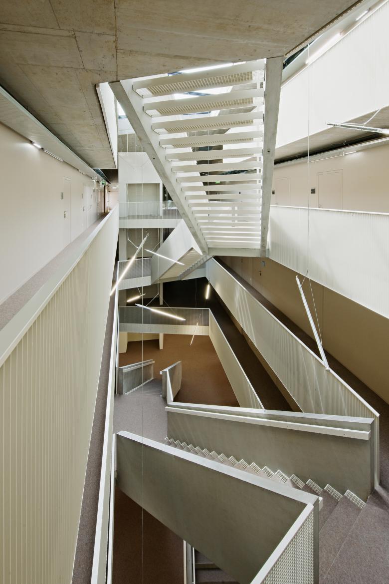 The spacious glazed interior atriums connect the floors with each other, allow light to fall into the lower levels and thus call for a new science working atmosphere of communication.