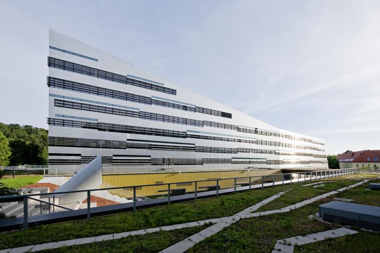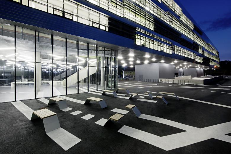 The first construction phase, the Mechatronics, opened in October 2009, already showed how the landscape flows between, over and through the building, with its floating office wings, interlocks with the area and ultimately merges with the building to form a newly interpreted campus.