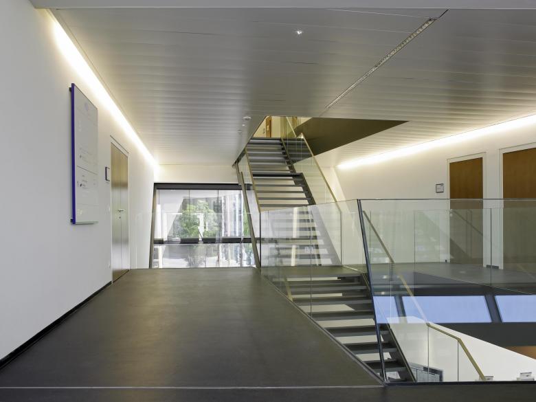 Im Inneren der Anlage wiederholt sich das System der städtebaulichen Raumverschränkungen. Im Zentrum steht die Veranstaltungshalle und die zweigeschossige Gastronomie. Durch Übergänge von ein- eineinhalb- und zweigeschossigen Raumkörpern auf unterschiedlichen Ebenen wird der Innen- und Aussenraum von jedem Blickwinkel aus mehrfach erlebbar. Die inneren Raumzusammenhänge erschliessen sich dem Betrachter gesamthaft.