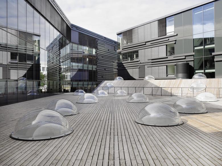 Durch die teils schwebende Ausführung der Baukörper und das offen gehaltene Zentrum des neuen Quartiers entsteht ein mehrfach durchlässiger Aussenraum zwischen den Baukörpern als neuer öffentlich - städtischer Freiraum. Die Aussenräume folgen in Ihrer gefalteten Oberfläche dem Faltungsprinizip der Baukörper und machen so den offenen Raum zwischen den Bauten auf unterschiedlichsten Ebenen erlebbar.