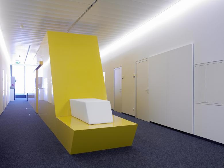 Die Gebäudehülle und die grossflächigen Wandelemente der Bereiche Gastronomie und Veranstaltungsraum bilden als Grundlayout in Anlehnung an die Dynamik der Raumelemente einen dynamisch linearen Strichcode aus. Analog zur Einrahmungsgeste des „Portals“ wird das gesamte Volumen des zentralen Gastronomiebereiches von einem raumgreifenden Decken- Wand- Sitzelement eingefasst.