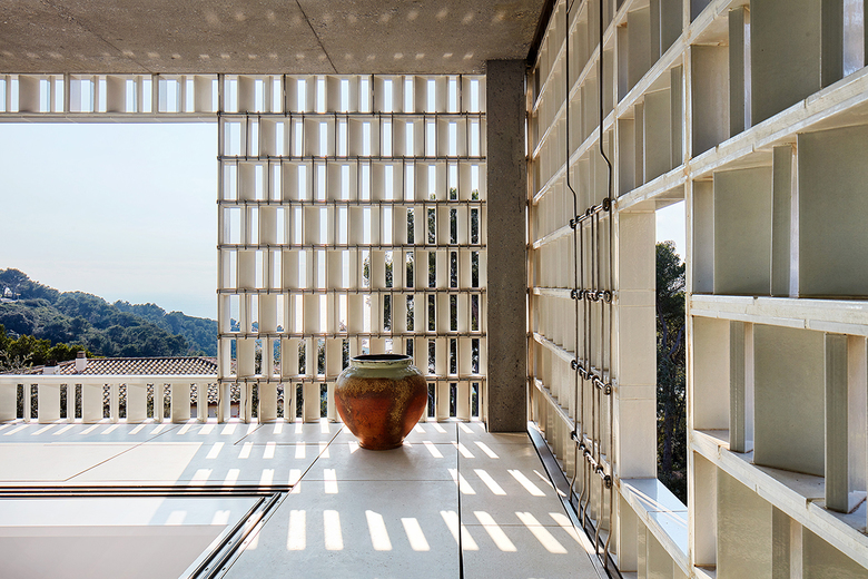 Entirely glazed, the south-facing rooms on the upper floor are shielded from the sun and provide a filter for the views via a delicate glazed lattice of ceramic that is separate from the glass frames.