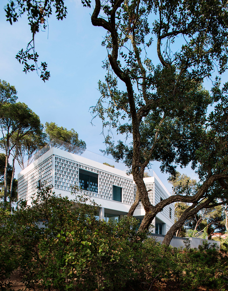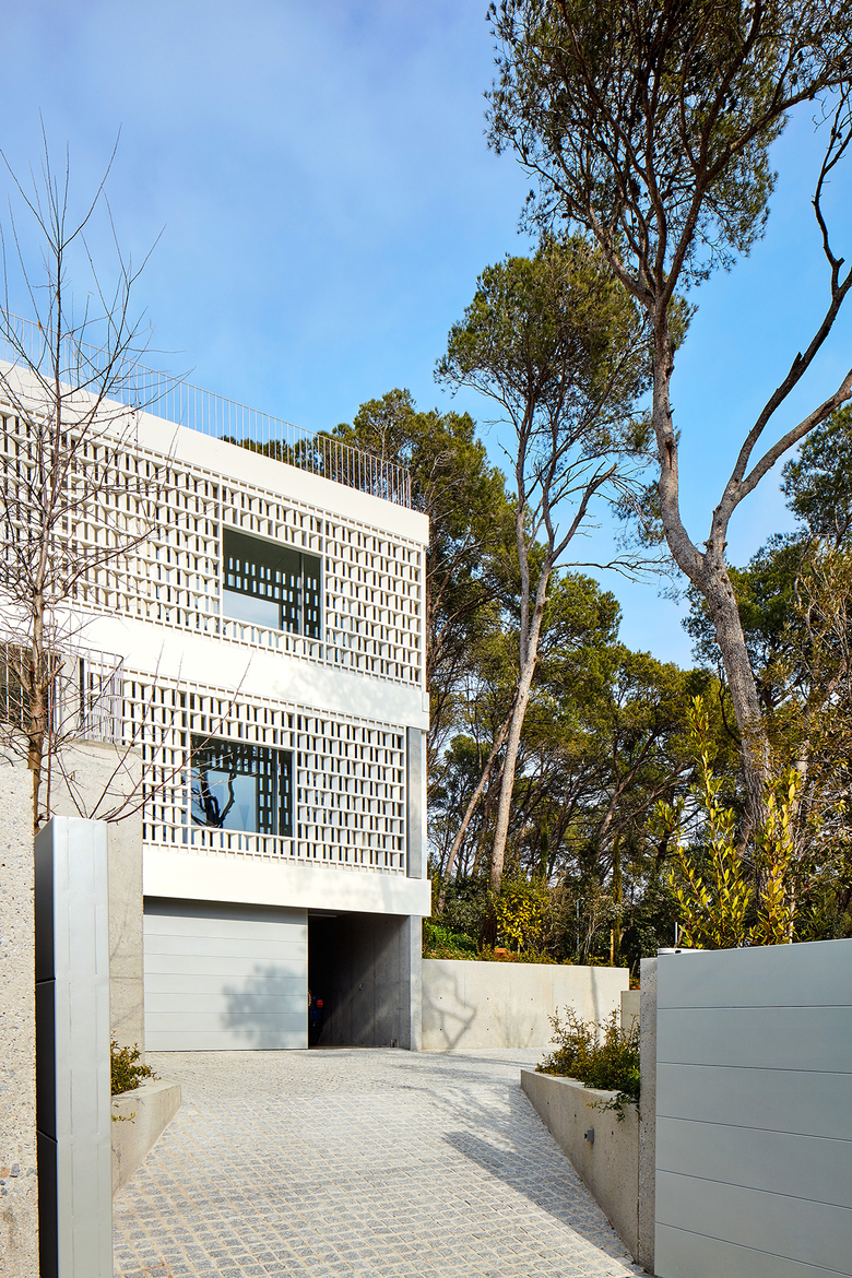 Two components of prefabricated white concrete provide a frame for the latticework: the upper component crowns the green roof of the building and the lower one conceals rolling shutters that enable the house to be shut up with complete security. The ensemble is delicately poised on the building’s load-bearing structure of sandblasted in situ concrete.