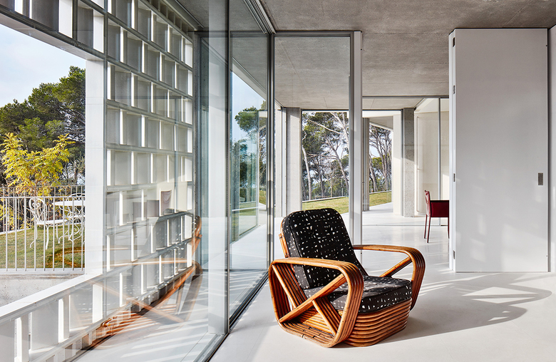 In the rooms in direct contact with the terrain the slim glass windows are set far enough back from the façade to avoid the sun coming in summer and to permit it to do so during the remaining seasons. These rooms are diaphanous, light-filled spaces conducive to family life, and their windows can be fully opened to become enormous porches integrated in the flat area of the garden. An airy outdoor kitchen located in the northern part of the house offers continuity to the indoor kitchen and looks out onto the sea through the living-room.