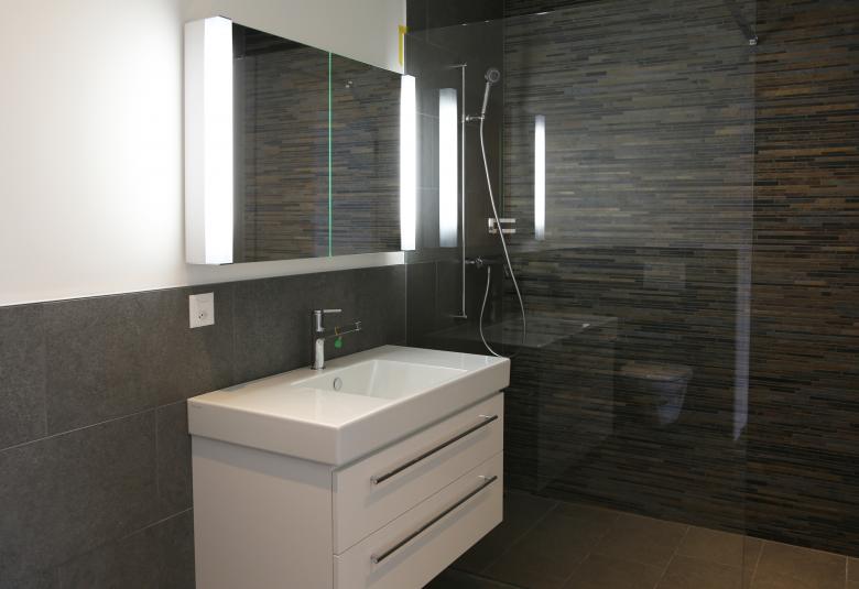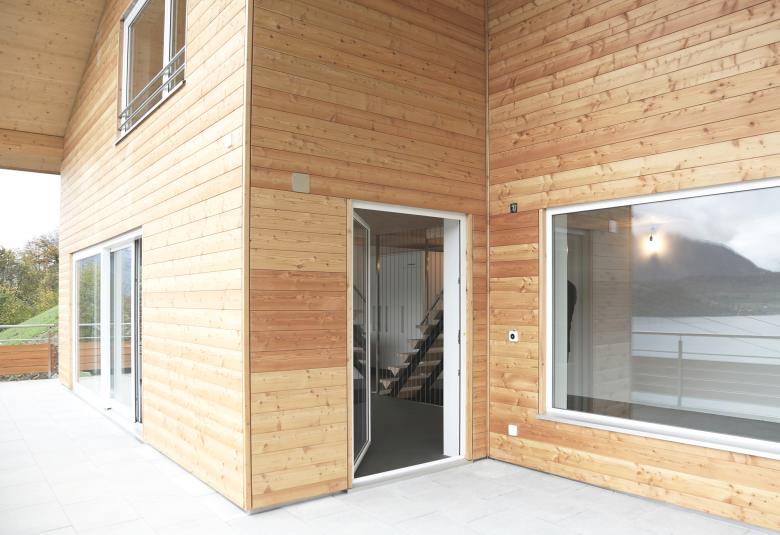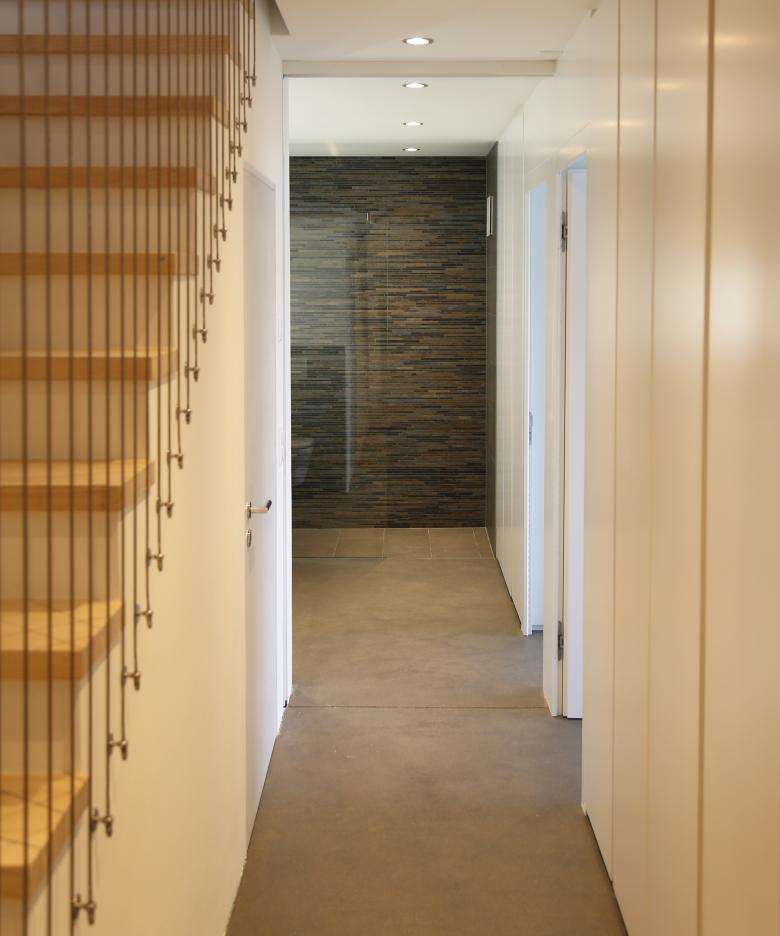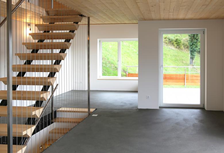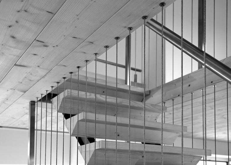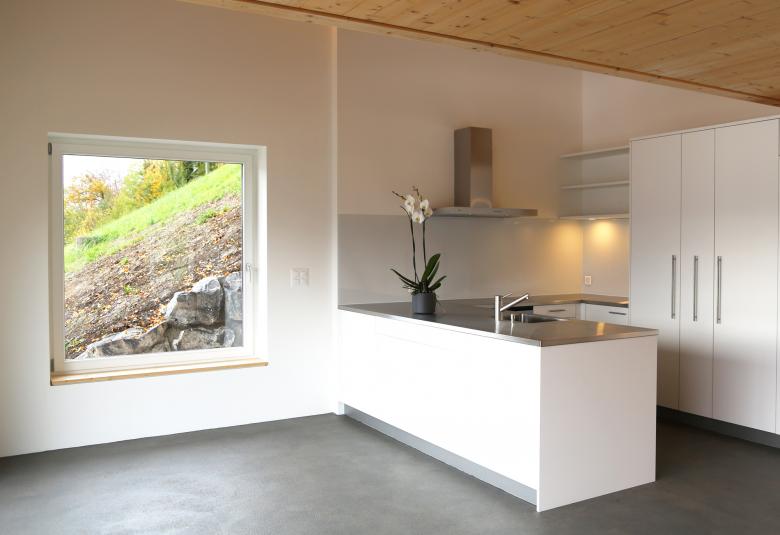 Das bestehende, bis 1971 bewohnte, kleine Holzhaus an einem steilen Hang mit direkter Aussicht auf den Thunersee und die umliegenden Berge entsprach nicht mehr den Bedürfnissen der Bauherrschaft. Diese entschied sich deshalb für einen Ersatzneubau auf der ausserhalb der Bauzone liegenden Parzelle in der Landwirtschafts- und Uferschutzzone. Der 100 m2 grössere Neubau auf dem schwer zugänglichen Gelände zeigt einen massiven Sockel aus Beton auf dem ein einfacher, leichter, vorgefertigter Holzelementbau in Trockenbauweise steht. Auf diese Weise konnte der Kostenrahmen sowie und der enge Terminplan eingehalten werden. Das Domizil für zwei Personen weist im Sockelgeschoss die beiden, getrennten Schlafräume mit den Badezimmern und der Technik auf. Darüber befinden sich der offene, lichtdurchflutete Wohn- und Essbereich sowie die Küche. Zuoberst liegt der abgeschrägte Dachraum als Galerie, der als Büro oder Bibliothek individuell genutzt wird. Umlaufende Terrassen binden die Räumlichkeiten ins Gelände ein. Präzis gesetzte Fenster rahmen die umliegende Idylle und geben die Sicht frei auf die unberührte Natur. Die gewählten Materialien Beton, Holz und innen zum Teil Stein und Metall sind bewusst robust, archaisch und entsprechen der Umgebung.