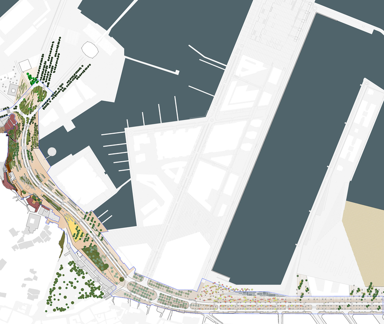Access to the harbour is possible from both sides of this front, thus the central area is released from the traffic, offering a big esplanade linking the old city with the sea. This reinstates the routes and relationships between the Medina and the sea.With the creation of new docks and the recovery of the industrial ones, the water surface of the harbour expands and approaches the city, as it was before.