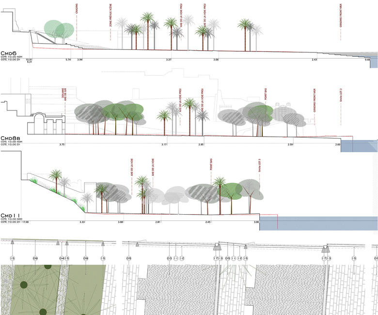 The public spaces system is based on the platform gained over the sea, offering a new urban waterfront, new perspectives and a new sequence of public space. Two main axes distribute this system: The first one, the facade ‘boulevard’, links the avenue of the ledge to the beach promenade and runs along the city’s historic facade.
