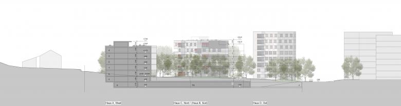 Drei Wohnhäuser und ein Bürohaus mit Tiefgarage