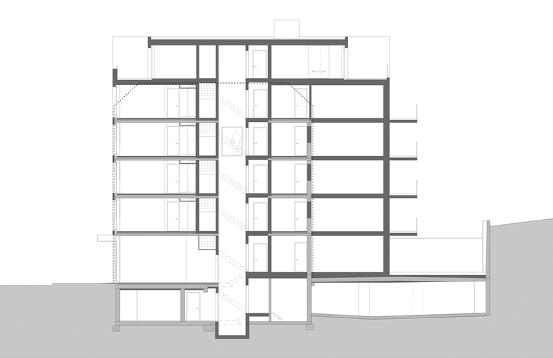 Ausnutzungsreserven und die Anpassung des Baugesetzes erlauben abermals eine Aufstockung um ein weiteres Geschoss und einen kleinen Erweiterungsbau im Hinterhof. Es werden ausschliesslich 1.5 Zimmer Appartments geplant und durch einen Mittelgang erschlossen. Mit dem Umbau wird mehr Wohnraum generiert und den jetzigen Kleinstwohnungen durch den Anbau etwas mehr Raum gegeben. Die grundlegende zweigeteilte Gebäudestruktur inkl. Treppenhaus bleibt dabei erhalten. Der Haupteingang wird auf die Strassenseite verlegt, wodurch eine klare Zugangssituation mit eindeutiger Adressbildung geschaffen wird. Auf der Rückseite entstehen attraktivere Aussenräume für die Bewohner. Die Gewerbeflächen im EG bleiben erhalten und können flexibel bespielt werden.